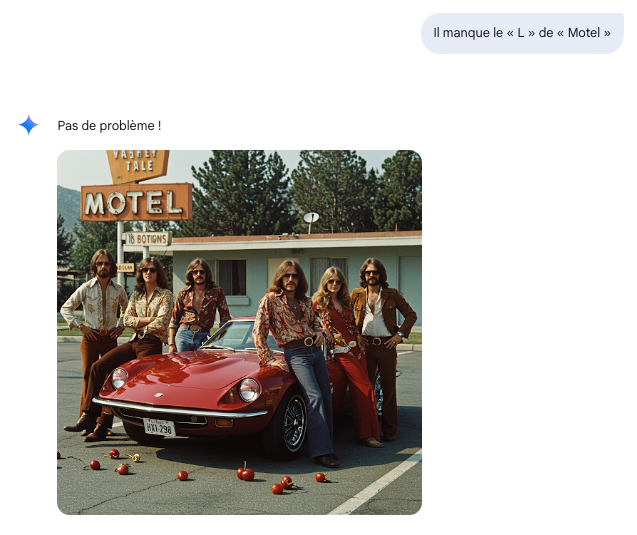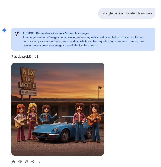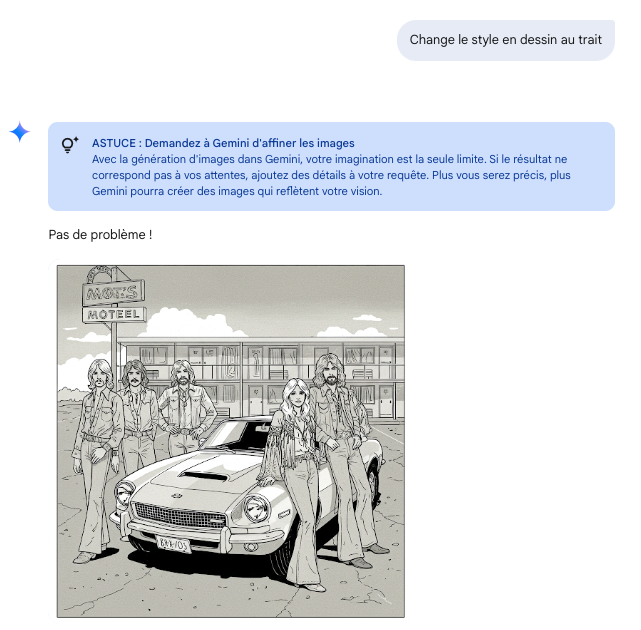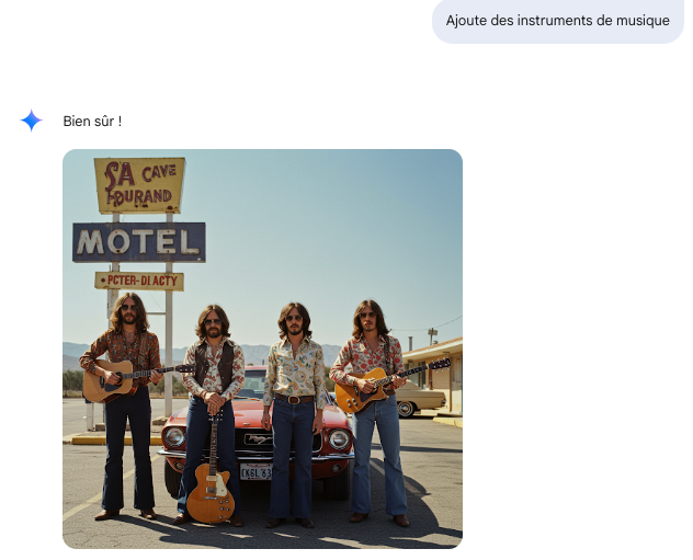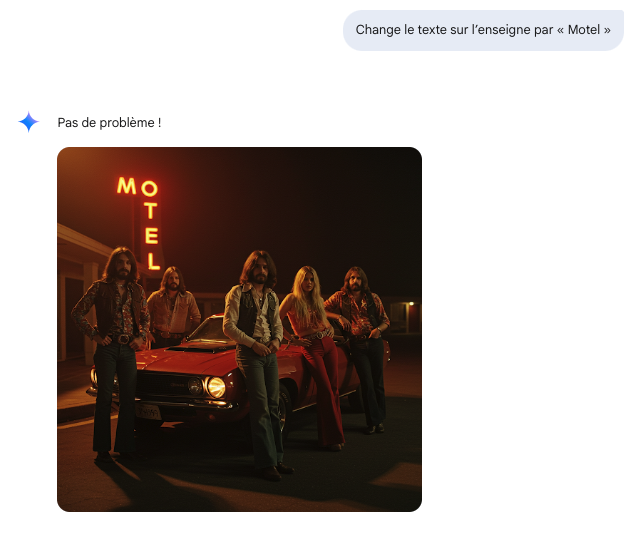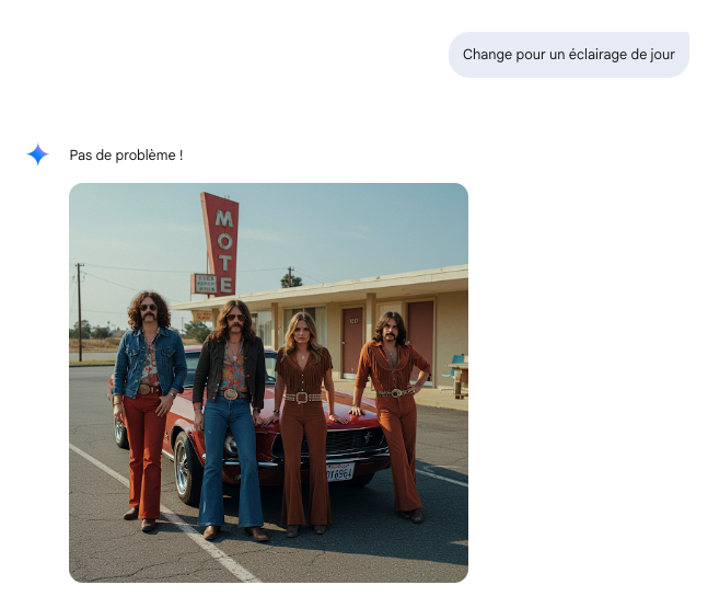 Mode conversationnel géré : Gemini reprend l’instruction précédente pour y intégrer les ajouts au fil de la conversation (pas de conservation des images, nouvelle génération).