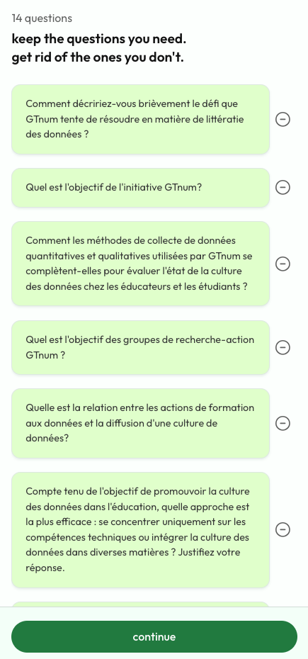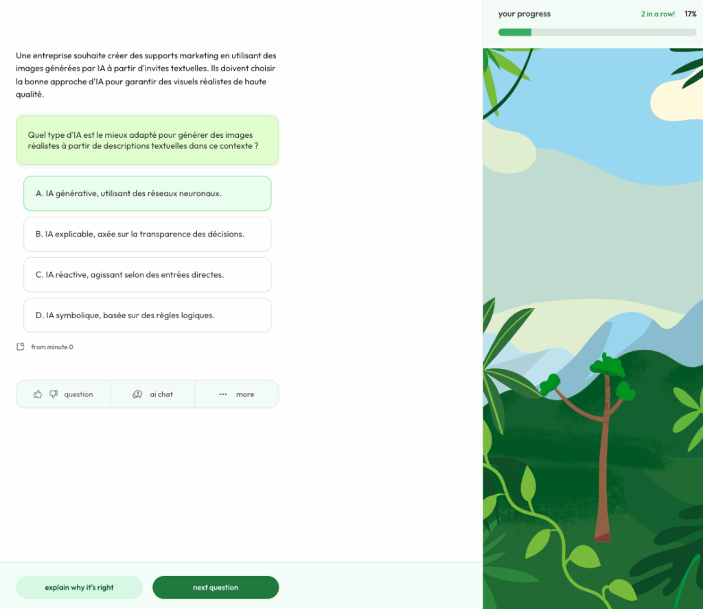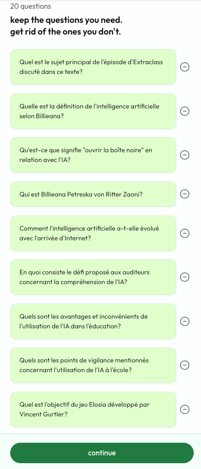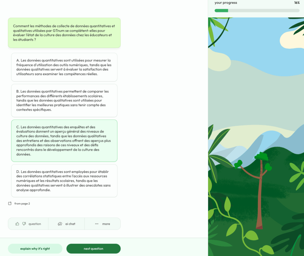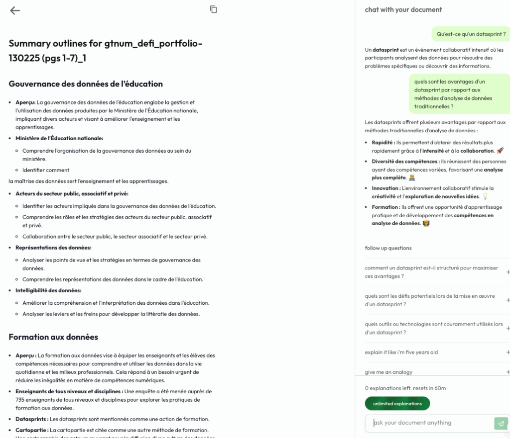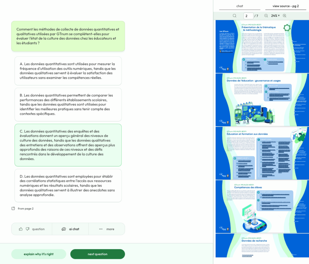 Un résumé du document avec chatbot permet d’augmenter la compréhension avant de répondre aux questions. Une programmation avec notifications, avant un examen par exemple, peut être activée.