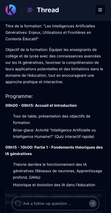 Kognitium (https://kognitium.com) est présenté comme un agent conversationnel + précis et qui « apprend » des échanges (LLM non cité). Suivi de la progression et partage. Accès sans compte possible, beta gratuite. Exemple: https://kognitium.com/thread/2aa8b132-58da-4890-acd4-cda795b46a8e…
