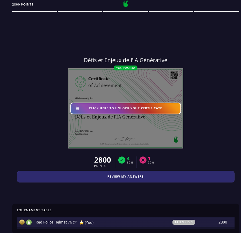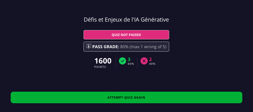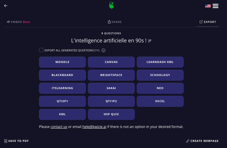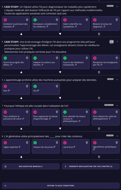 Choix du nombre de questions, édition après génération, pourcentage et certificat de réussite, partage par url / qr code. Export multiple.