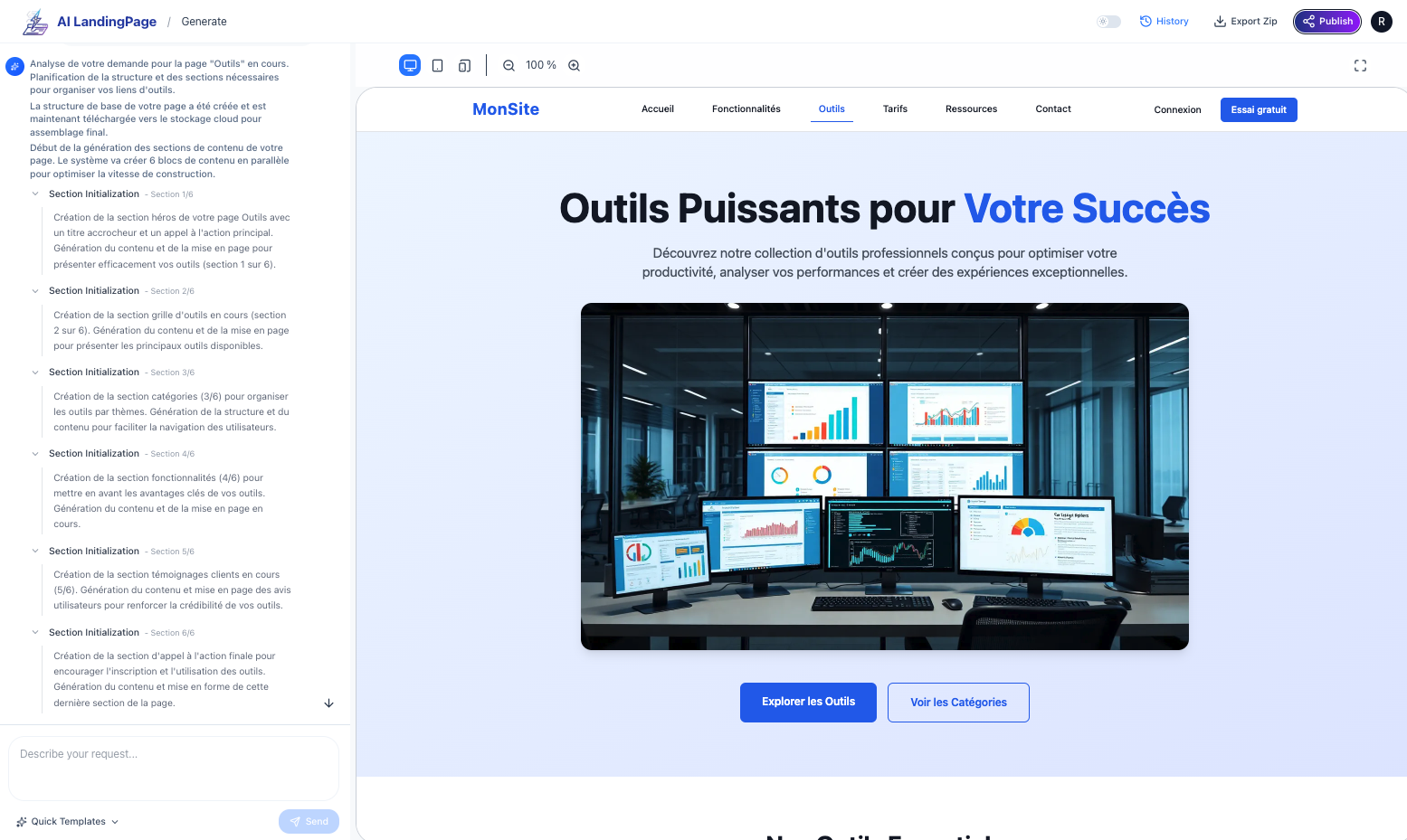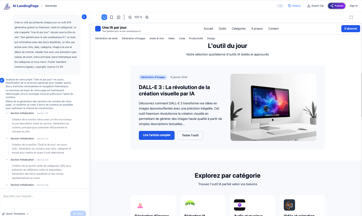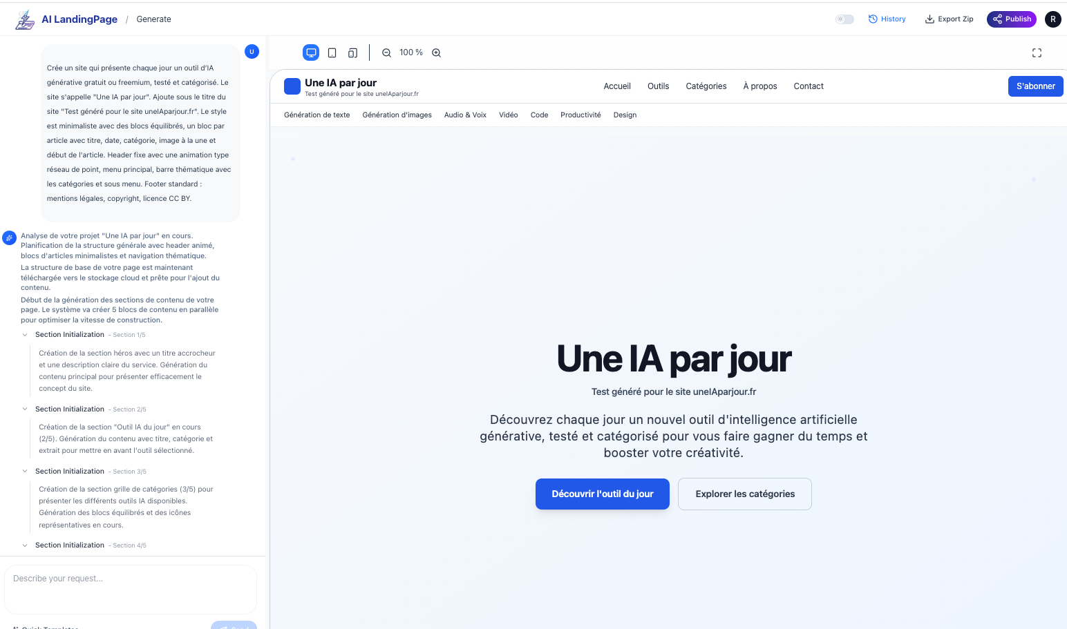 Landing Page (https://landing-page.io/) génère une page html à partir d’une instruction avec itérations possibles (sans mémoire de la conversation, il faut donc enchaîner les demandes de modifications avant de générer d’autres pages du projet).