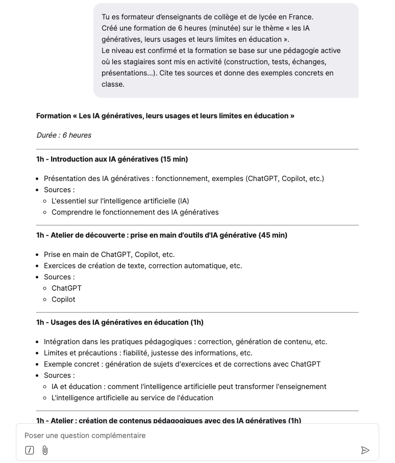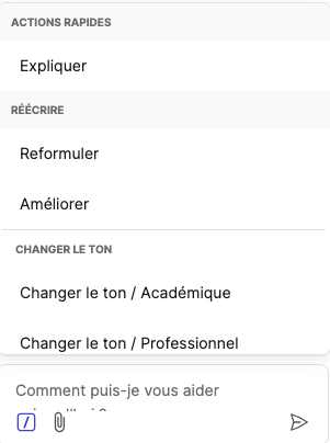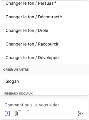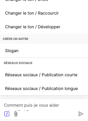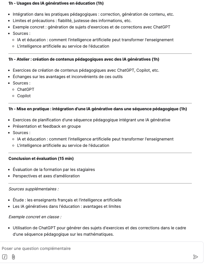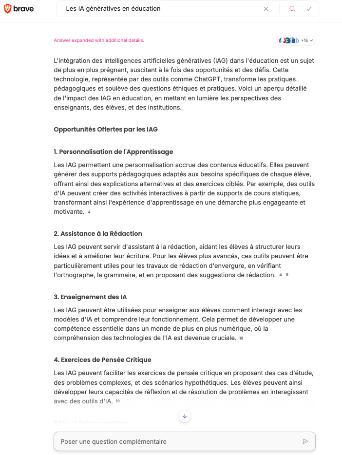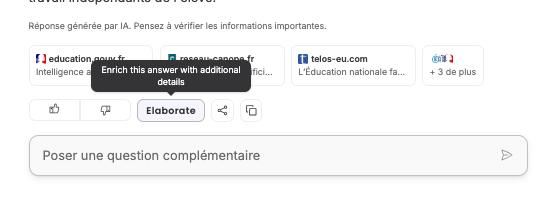 Des instructions pré-définies sont proposées dans le moteur de recherche (réponse développée via le bouton « Elaborate ») et dans le chatbot.
