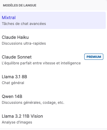 Plusieurs modèles de langage sont proposés (Mixtral 8x7B, Claude Haiku – 3.7 sonnet en version premium -, Llama 3.1 8B, Qwen 14B et Llama 3.2 11B Vision) avec possibilité d’ajouter ses propres modèles via une clé API.