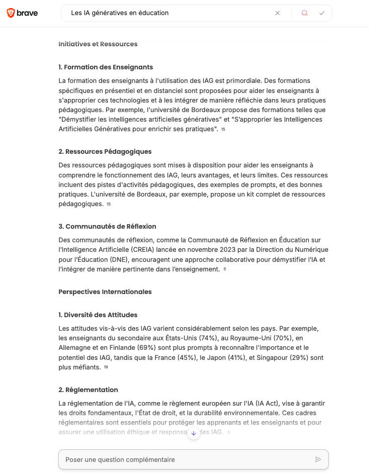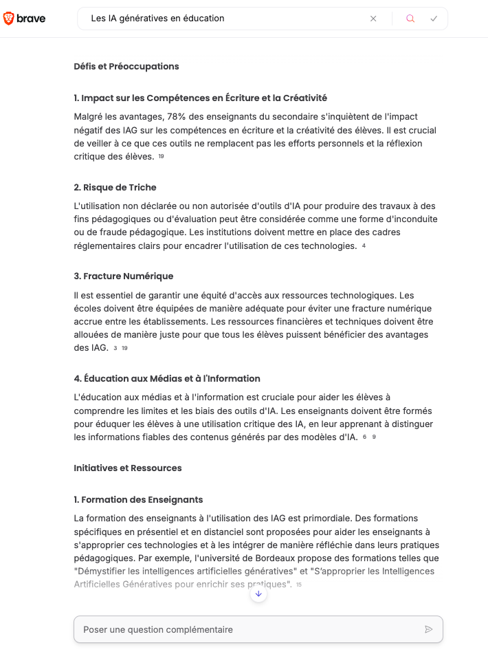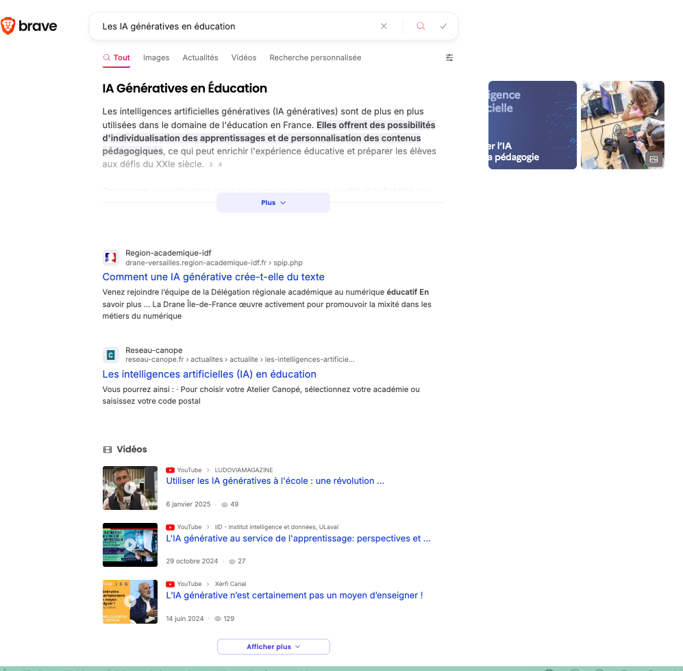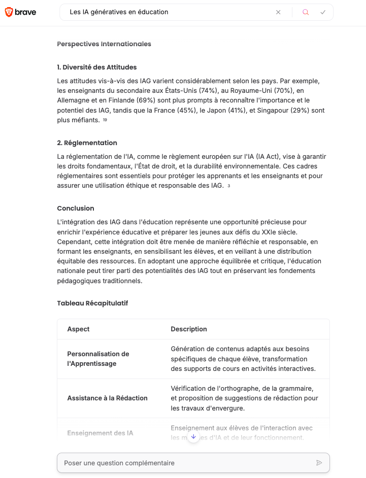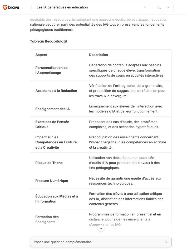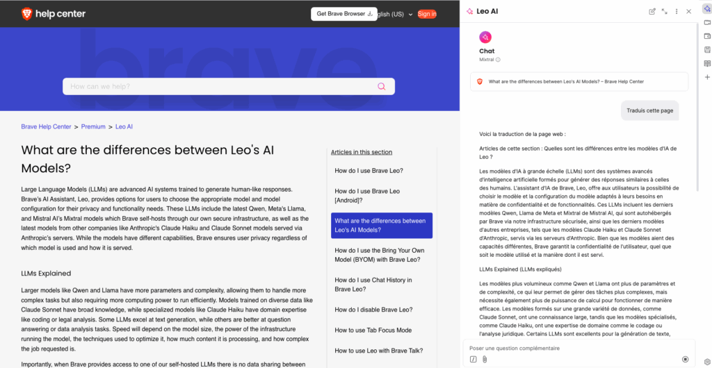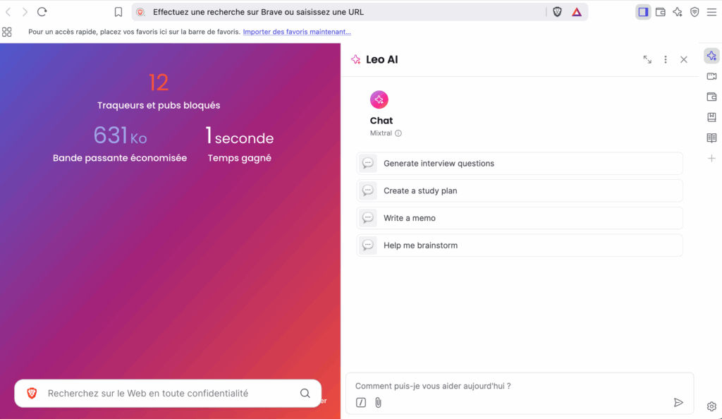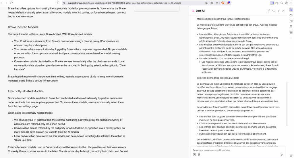 Leo (https://brave.com/leo/) est l’assistant IA du navigateur Brave intégré à son moteur de recherche et disponible dans un volet latéral sous forme de chatbot qui peut interroger la page consultée.