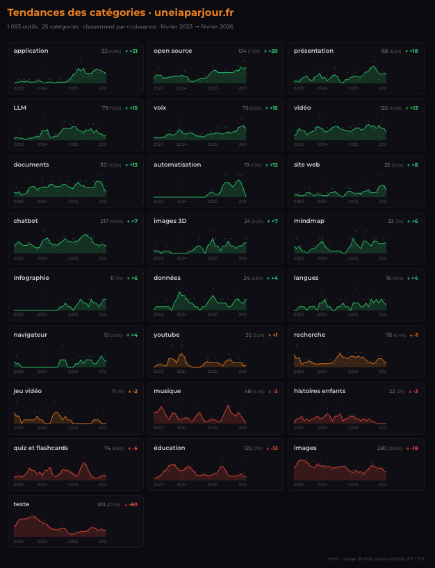 Avec la mise à jour de la base des articles du site, je me suis amusé en début de semaine à observer l’évolution des catégories au fil de ces trois années. J’en ai fait une visualisation “multiple” avec Claude :