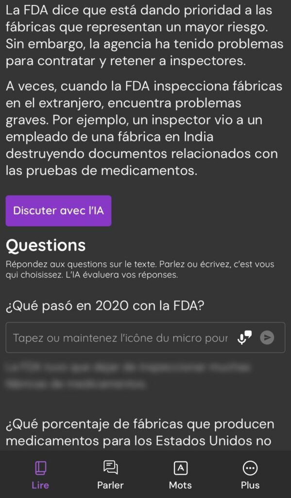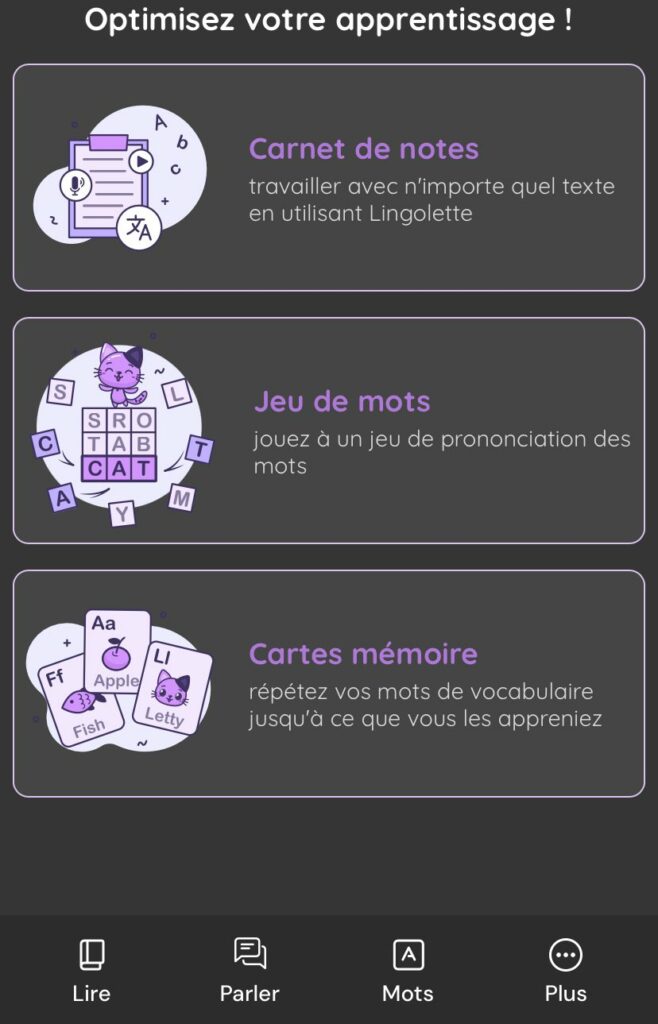 Lingolette (https://lingolette.com) accompagne l’apprentissage des langues via des situations de la vie courante dans un chatbot texte et voix, jeux, flashcards et exercices de compréhension. Correction instantanée. Version premium avec plus d’exercices.