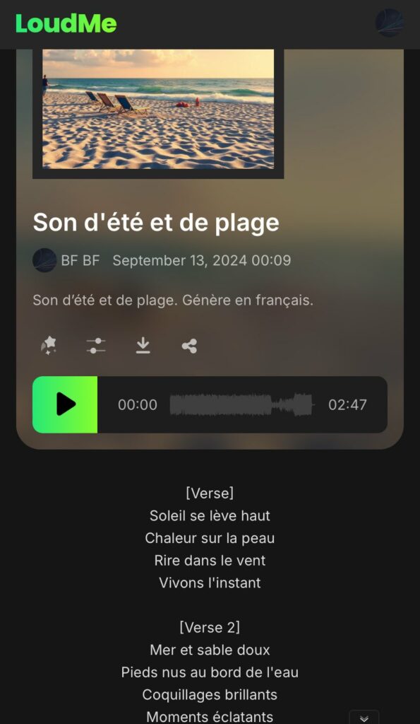 LoudMe génère des musiques (https://loudme.ai/ai-music-generator) ou des bruitages (https://loudme.ai/sound-effect-generator), avec ou sans paroles à partir d’un prompt ou d’un morceau déjà généré. Morceaux libres de droit. Paroles en français si spécifié. 100 crédits par mois (20 musiques et 50 bruitages).