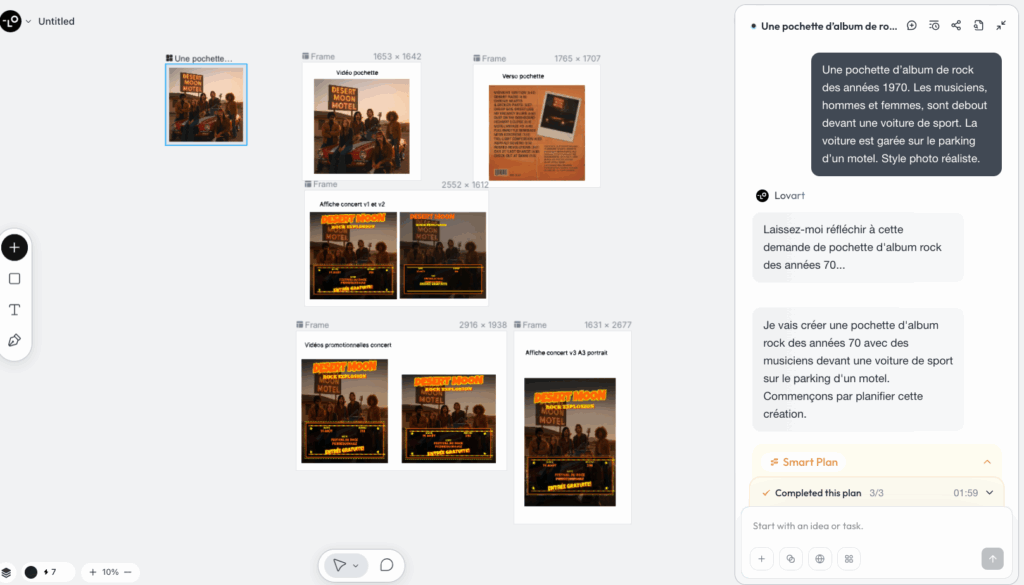 Loveart (https://www.lovart.ai/) génère images et vidéos à partir d’un chatbot et d’un tableau blanc.