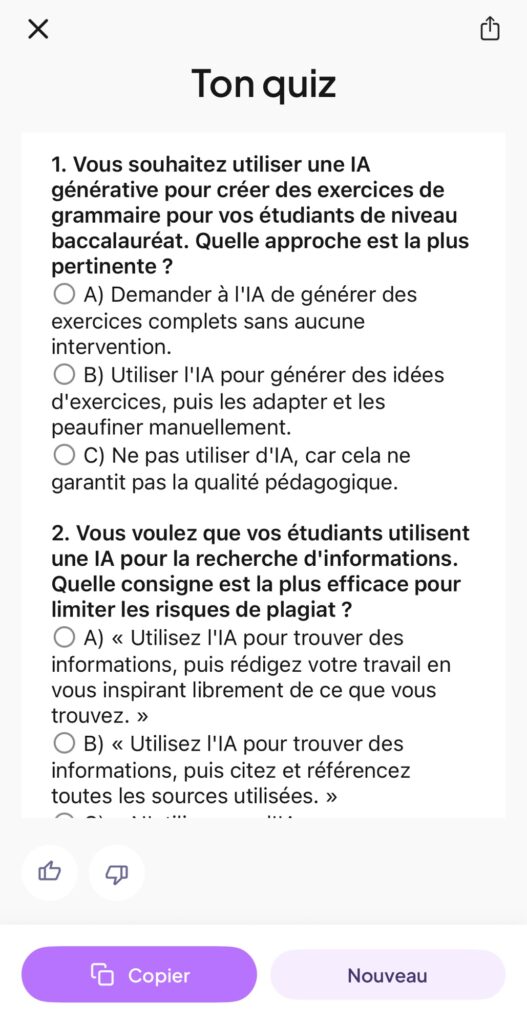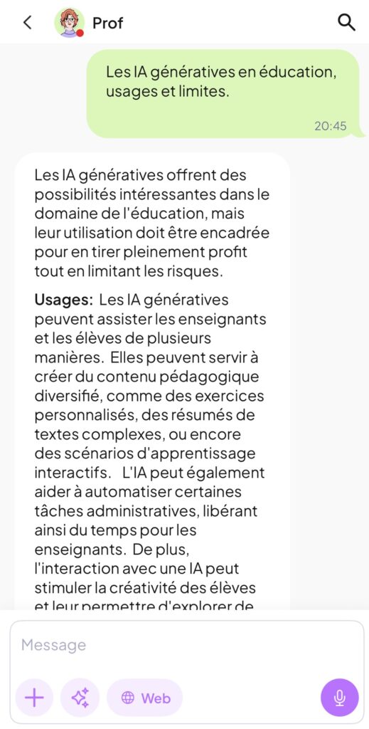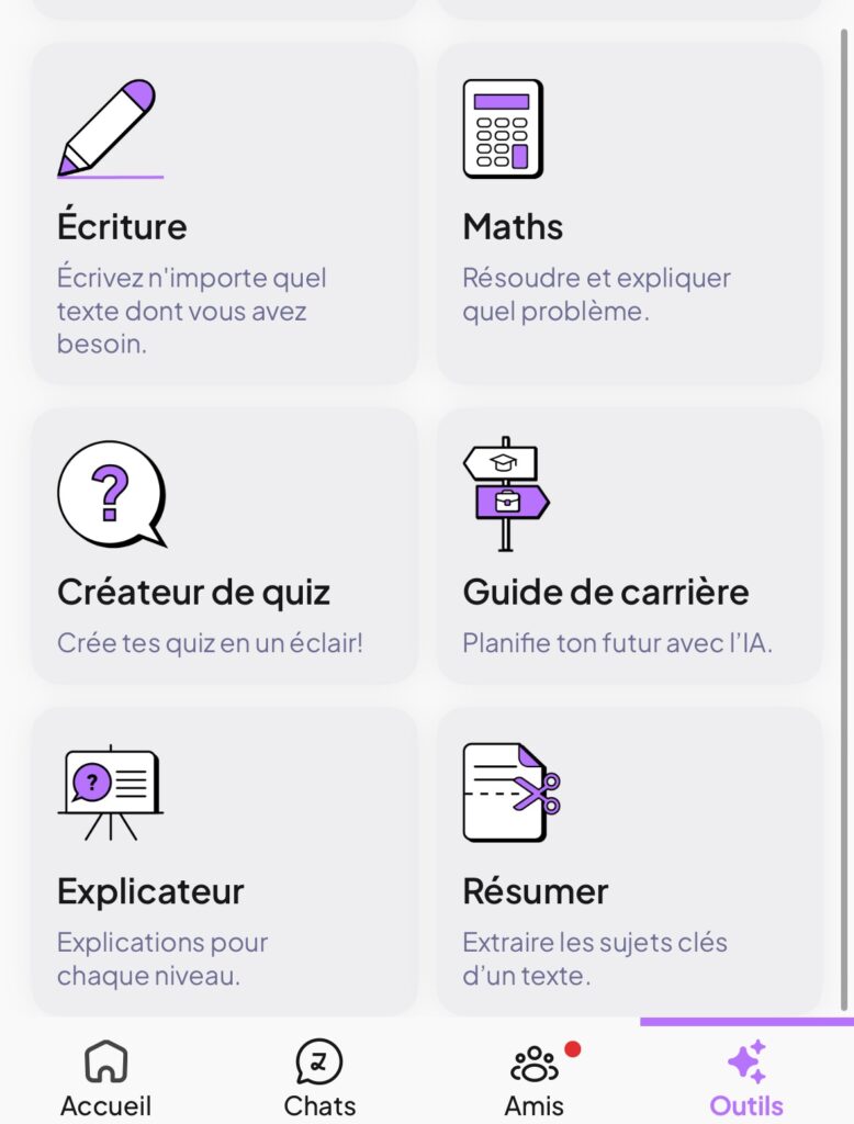 - Outils : correcteur, traducteur, code, explications, quiz etc.