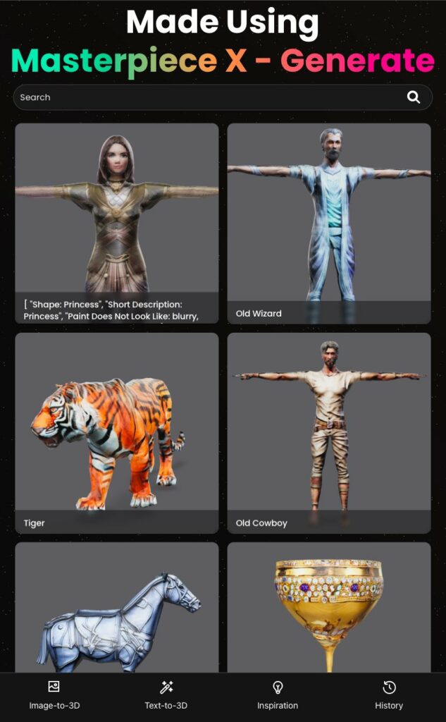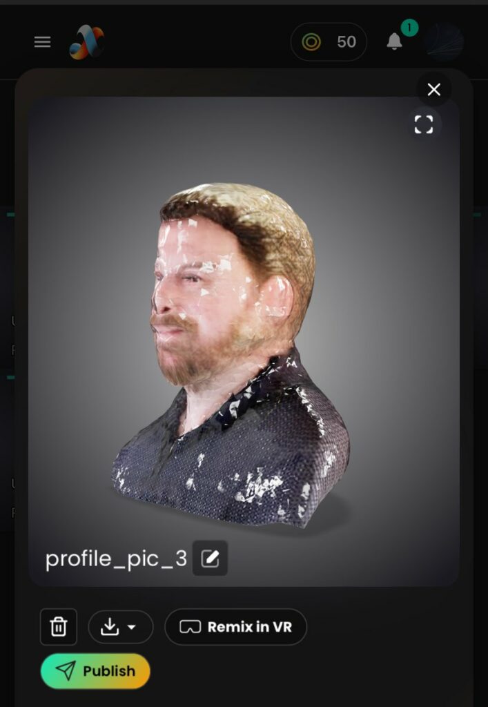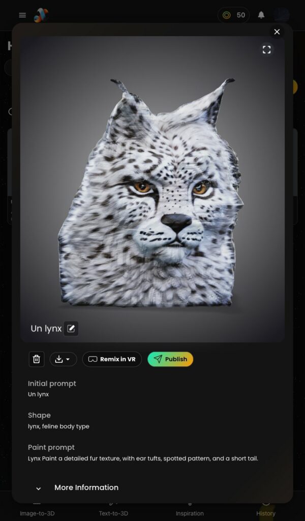 Masterpiece X (http://masterpiecex.com) génère des modèles 3D à partir d’une image ou d’une instruction. Export glb, Fbx, usdz. Partage url et VR pour meta quest. Galerie avec téléchargement. 250 crédits à l’ouverture (par mois ?), 50 utilisés /génération.