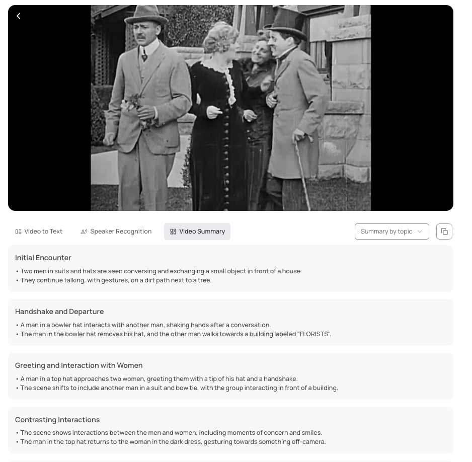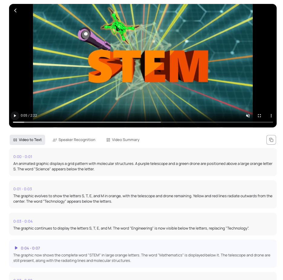 Il permet l’analyse fine de vidéos (reconnaissance et compréhension des scènes, reconnaissance et transcription des voix, résumé…), la génération d’extraits et les générations de nouvelles vidéos à partir d’une vidéo source.