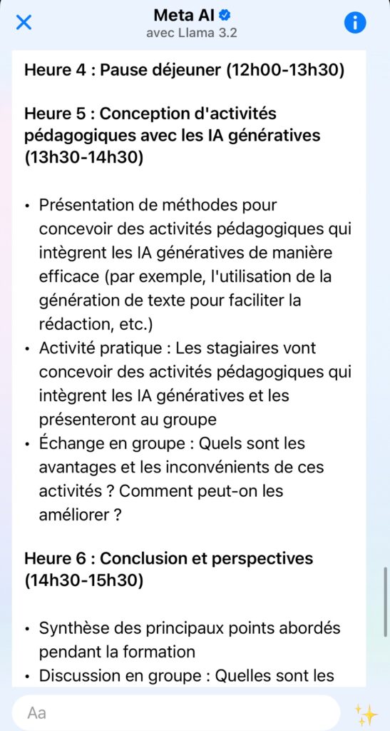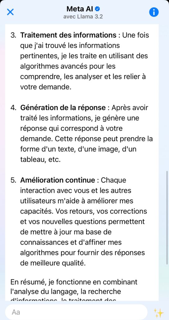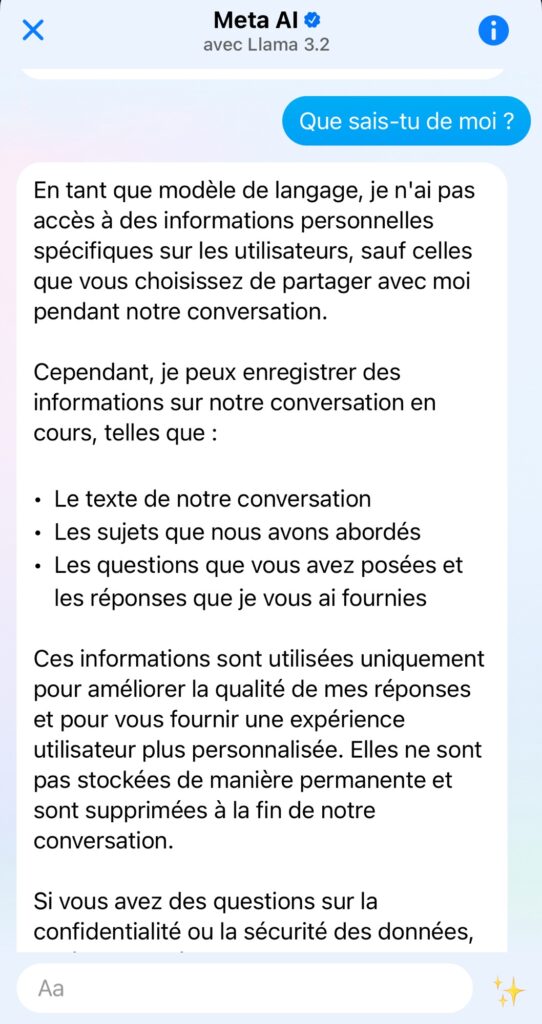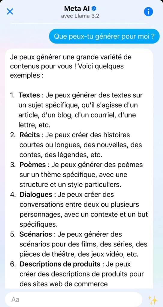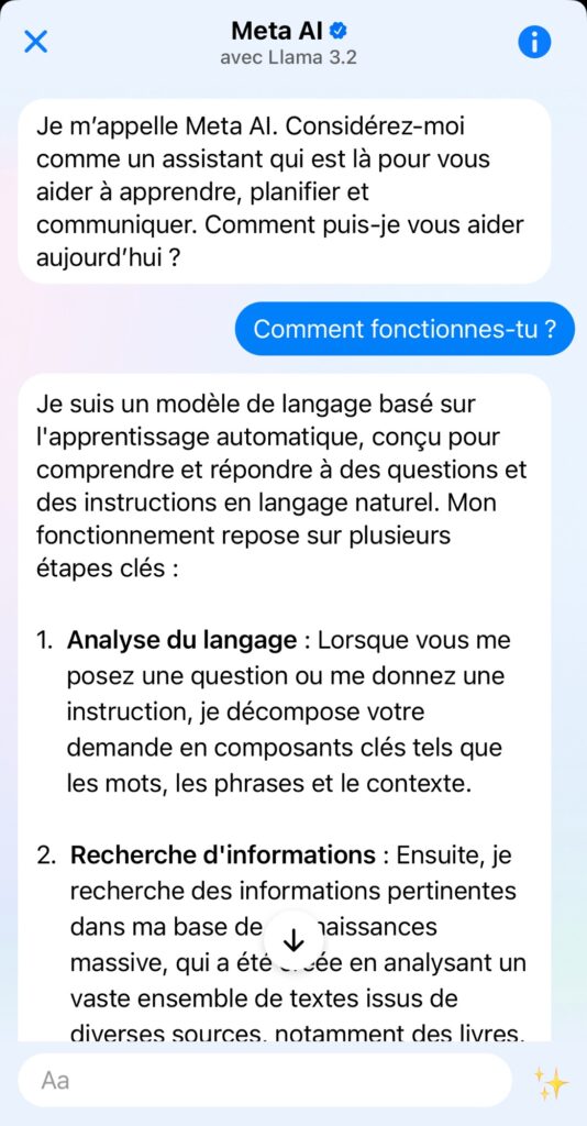 Meta AI (WhatsApp : https://faq.whatsapp.com/2257017191175152 / Messenger : https://www.facebook.com/help/messenger-app/671966618200379 ) est l’agent conversationnel texte de Meta basé sur Llama 3.2 et intégré à WhatsApp et Messenger.