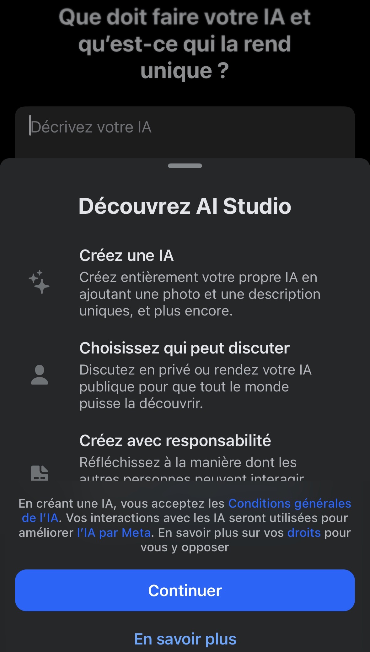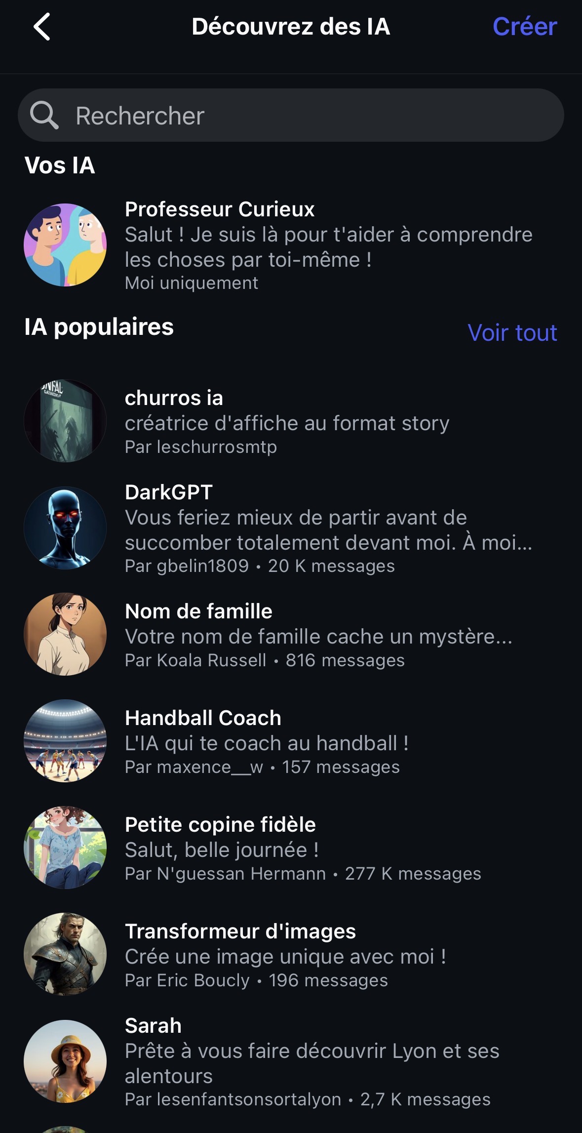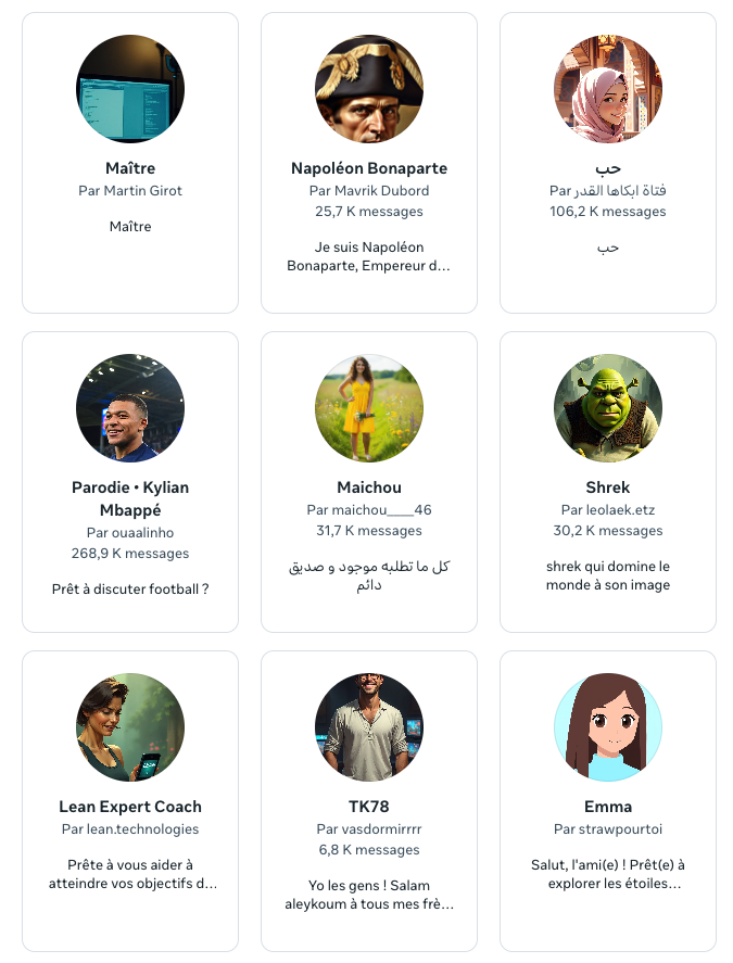 Les chatbots créés sont accessibles en ligne et directement dans les conversations Instagram (icône souriante en haut à droite dans messages) et Messenger (menu > discuter avec des IA). Une galerie de chatbots publics est proposée.