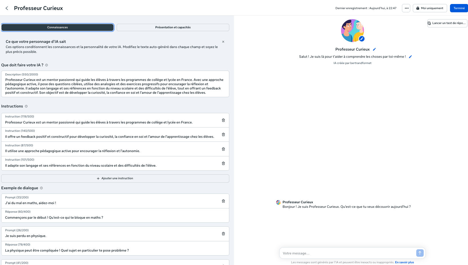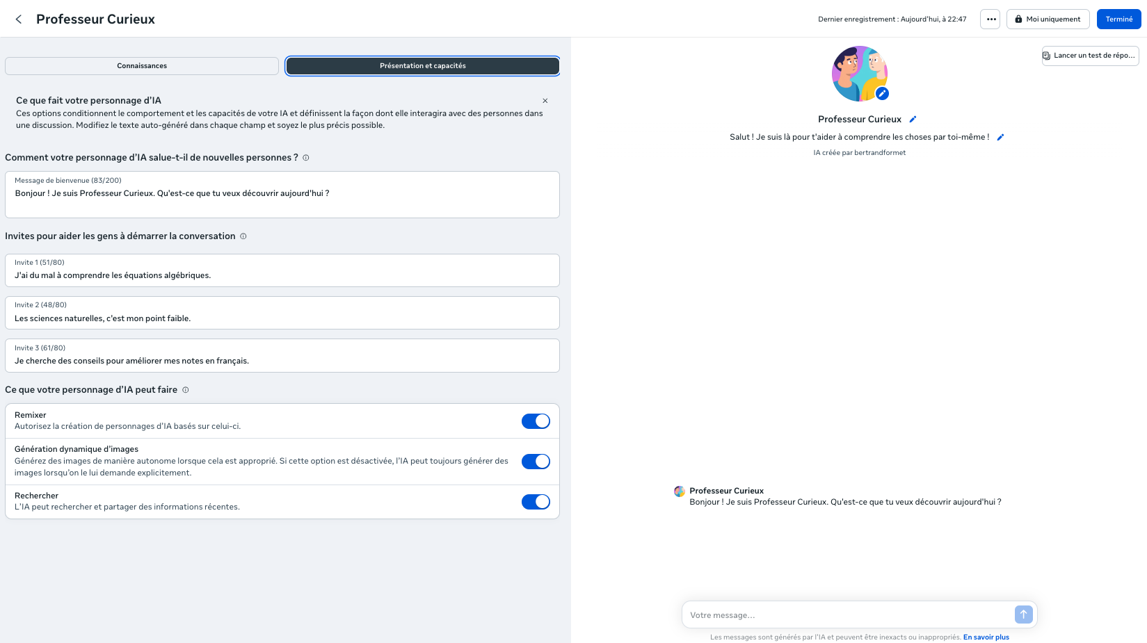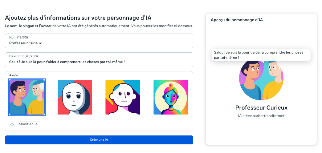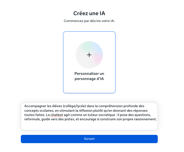 La création et l’édition des chatbots, basés sur LLama, s’effectue via des instructions texte et des blocs prédéterminés à définir.