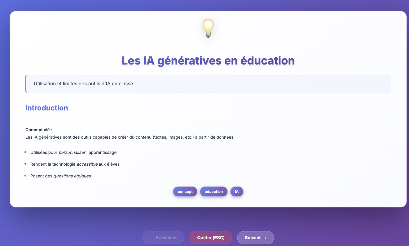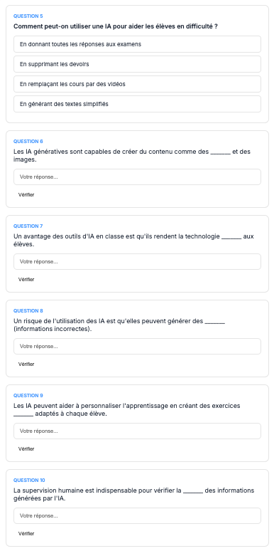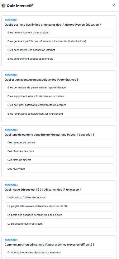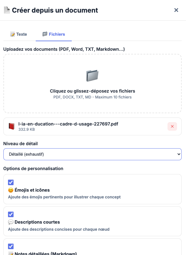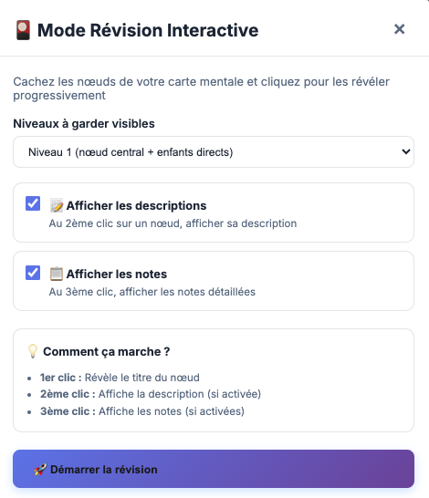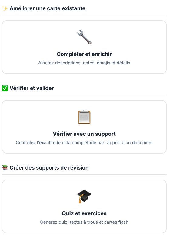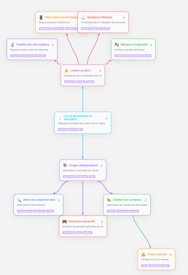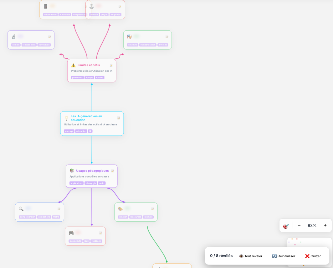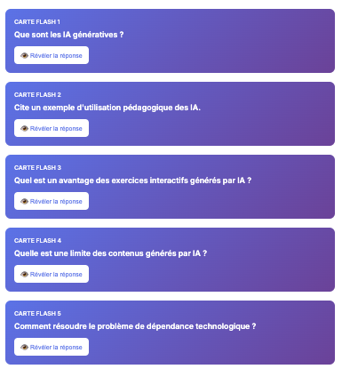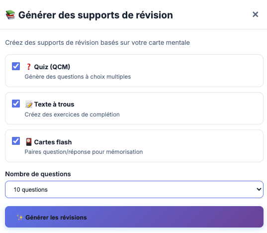 Mindmaclasse (https://apps4edu.fr/mindmaclasse/) génère des cartes mentales à partir d’une instruction ou d’un document ainsi que des exercices pour réviser (quiz, textes à trous et flashcards avec export txt des résultats).