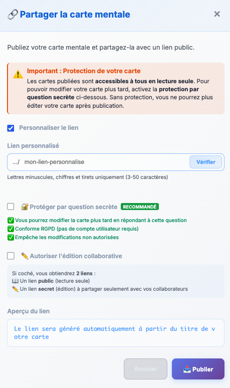 Partage par url avec personnalisation du lien, code secret et collaboration.