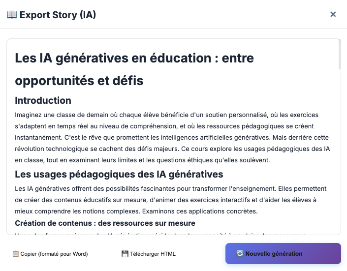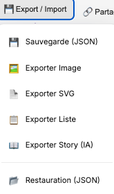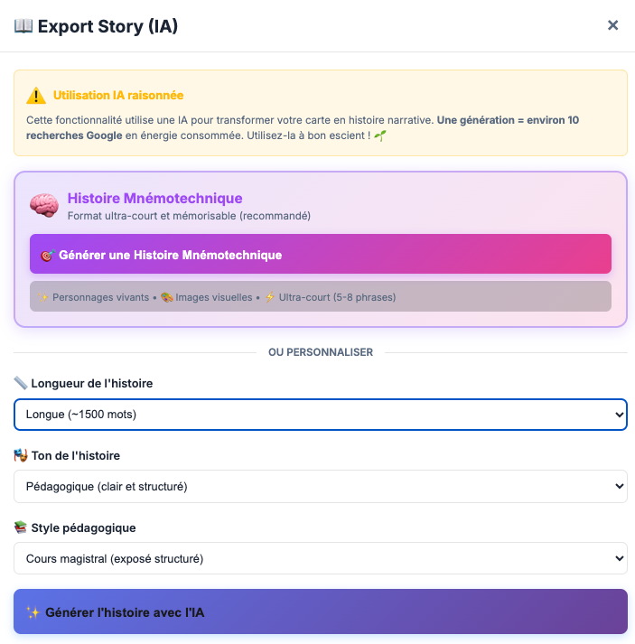 Export en 5 formats dont « Story IA » ou la carte est générée sous forme de texte.