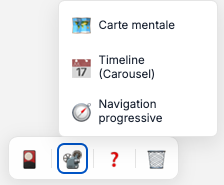 Du côté des fonctionnalités de présentations des cartes mentales, 5 présnetation sont proposées. La présentation Timeline génère une présentation noeud par noeud, un mode révision cache puis révèle les noeuds de la carte.