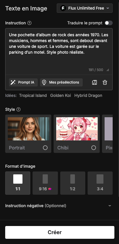 À partir d’une instruction, d’un format et/ou de styles présélectionnés, les ocntenus sont générés et téléchargeables avec filigrane.