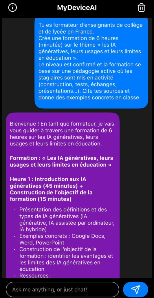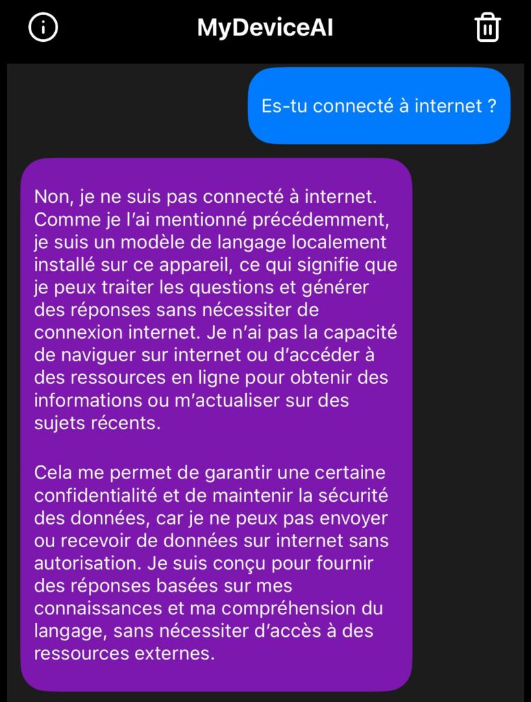 MydeviceAI de @navedmer (https://apps.apple.com/fr/app/mydeviceai/id6736578281…) est un chatbot pour iOS (à partir d’IPhone 13 Pro) basé sur Llama 3.2 et installé localement. Fonctionne sans connexion internet une fois installé, les données transmises restent locales. Gratuit et illimité.
