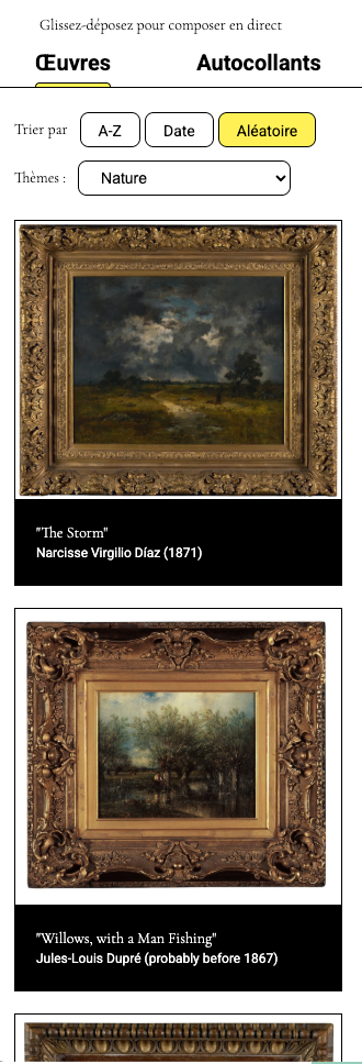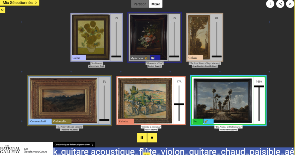 National Gallery Mixtape (https://artsandculture.google.com/experiment/national-gallery-mixtape/iwHPaSXS-zrryg?hl=fr) est un projet commun de la National Gallery de Londres et Google Arts et Culture.