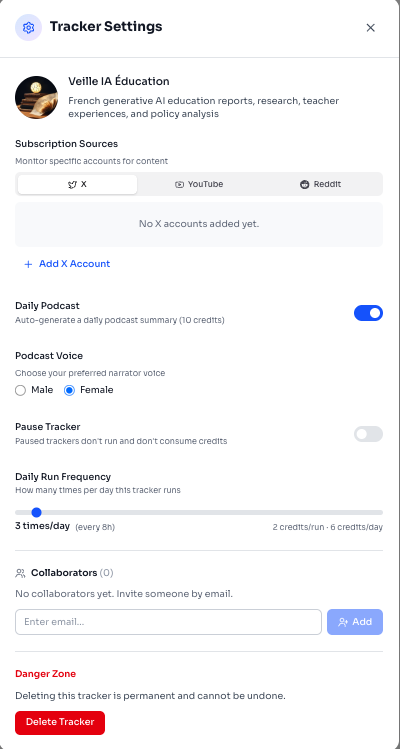 Une fois le champ de la veille défini, un « tracker » va proposer une curation à des intervalles réguliers définis dans les préférences (3 fois par jour dans la version gratuite).