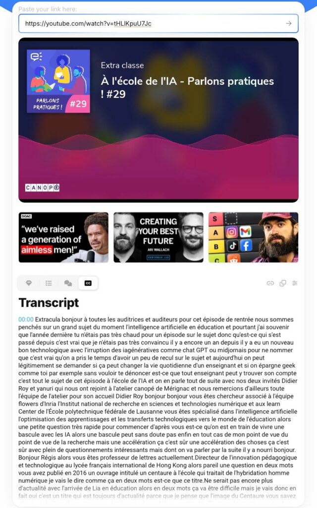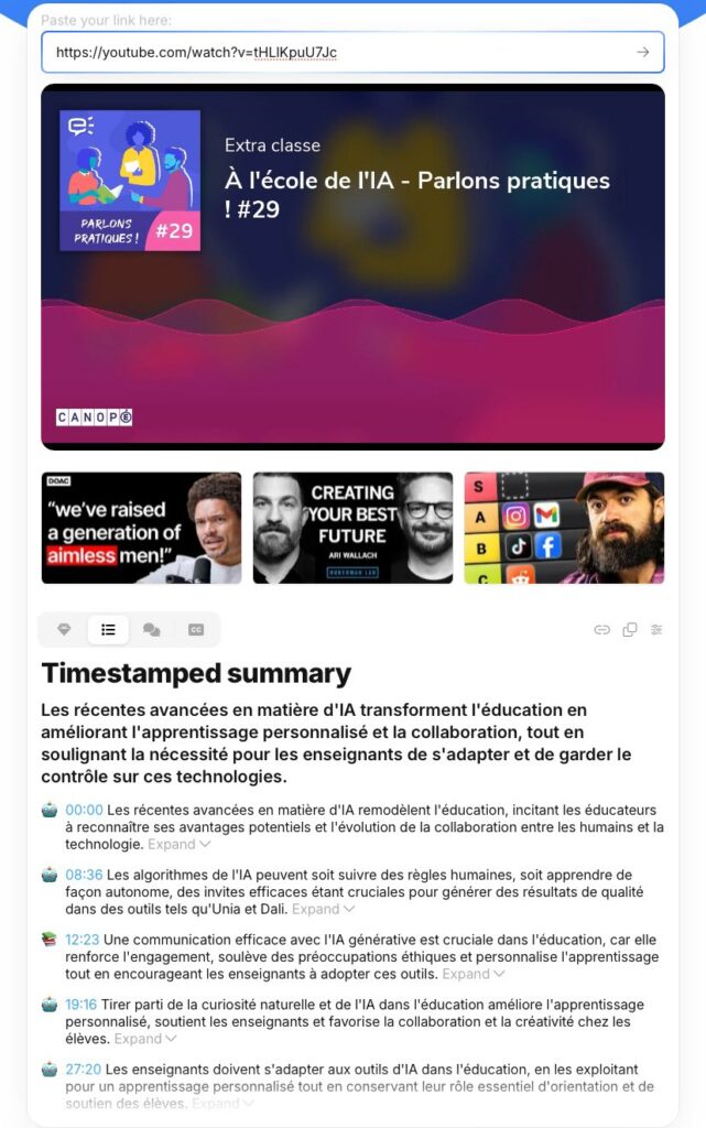 Noiz (https://noiz.io) résume des vidéos Youtube en plusieurs formats (listes, question / réponses…), longueurs et 50 langues. Propose également la transcription et les moments clés minutés. Extension chrome disponible et application à venir. Sans compte.