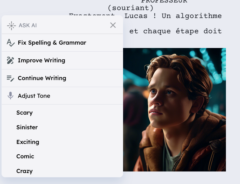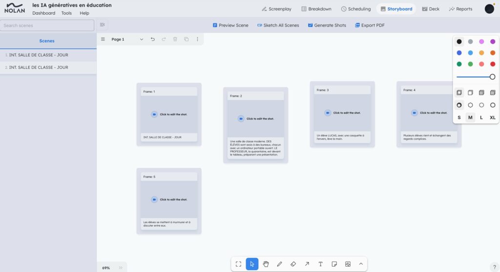 Nolan (http://nolanai.app) accompagne l’écriture d’un scénario jusqu’au storyboard : génération éditable avec des outils IA, illustrations avec images générées. Quelques fonctionnalités limitées et assistant IA pendant 30 jours dans la version gratuite.