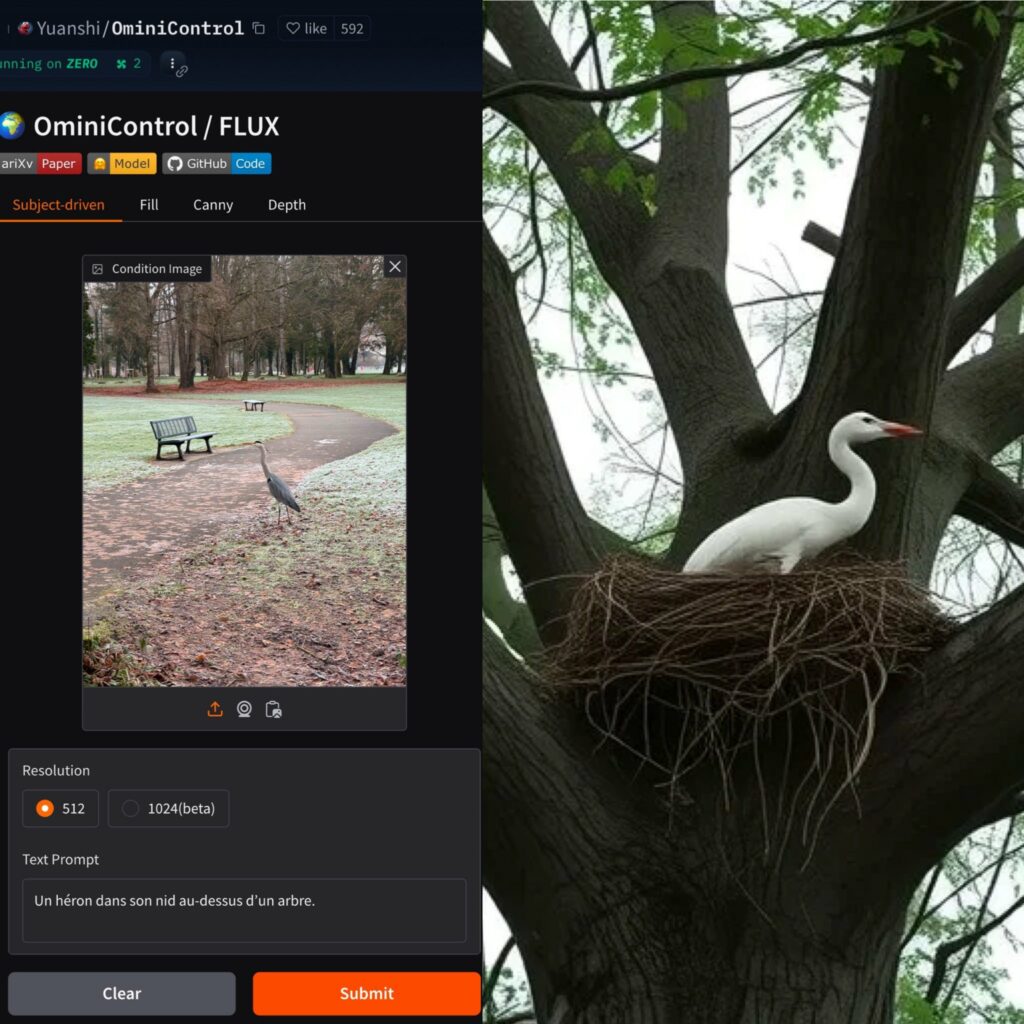 Omnicontrol (https://huggingface.co/spaces/Yuanshi/OminiControl…) génère des images à partir d’une image source et d’une instruction. Génération basée sur un modèle d’analyse de l’image et Flux 1. Gratuit, open source et illimité.