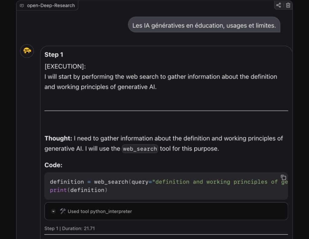 Open Deep Research (description : https://huggingface.co/blog/open-deep-research et espace démo : https://huggingface.co/spaces/m-ric/open_Deep-Research ) est l’agent de recherche « avec raisonnement » développé par Hugging Face… en 24h après la publication de Deep research d’OpenAI.