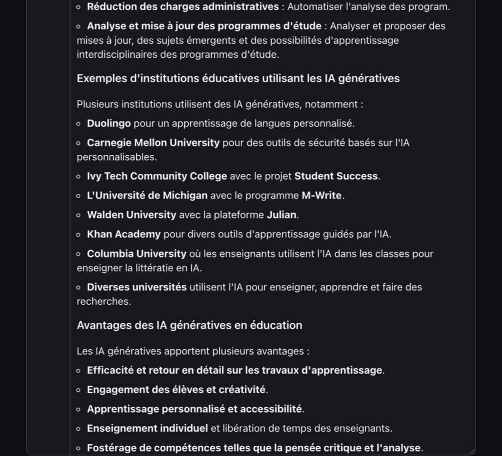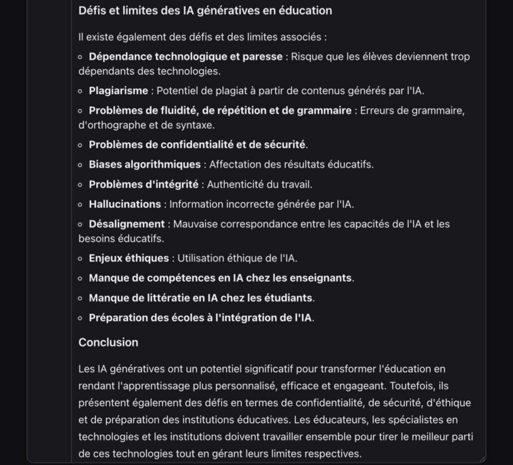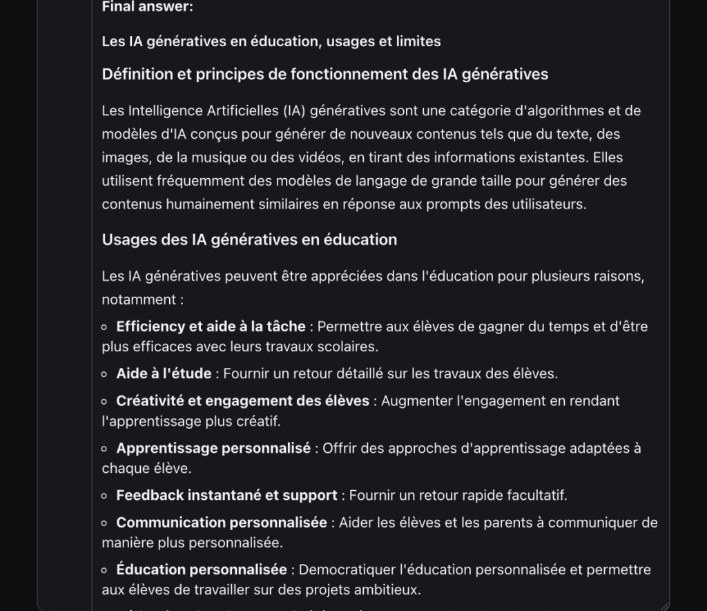 Test avec l’instruction « Les IA génératives en exsudation, usages et limites » :