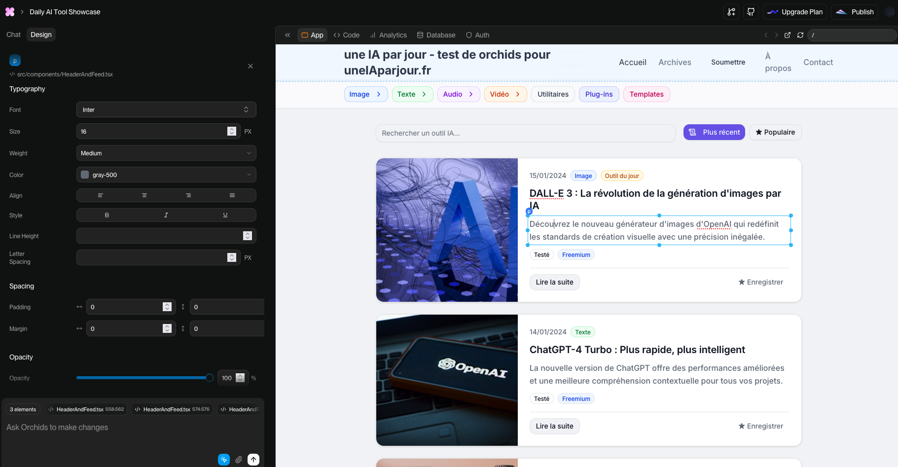 Une fenêtre de chat est présente pour les itérations et chaque élément du site peut être modifié manuellement ou par une nouvelle instruction.