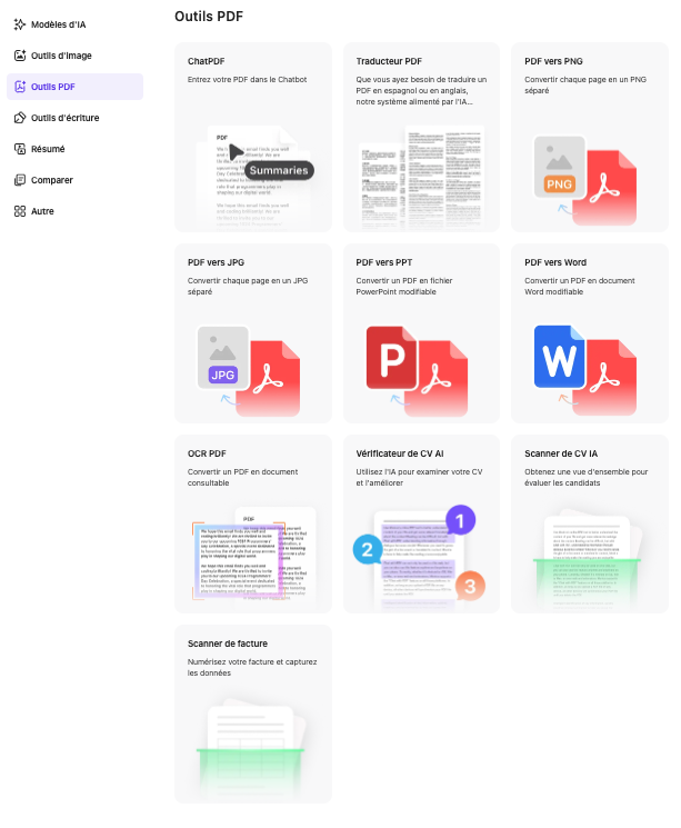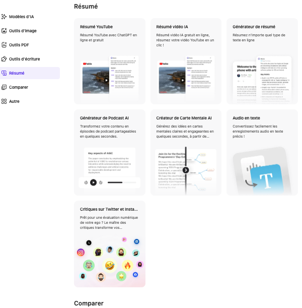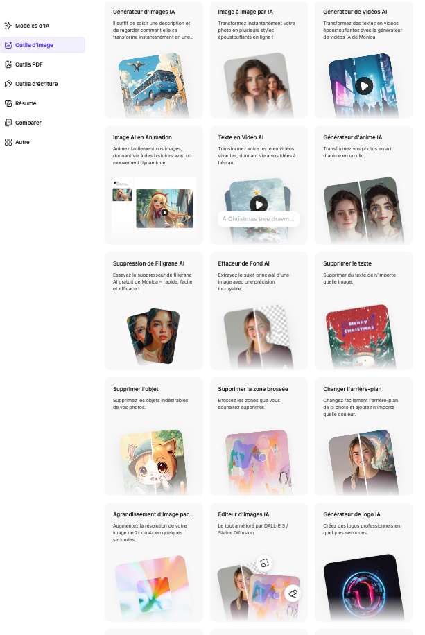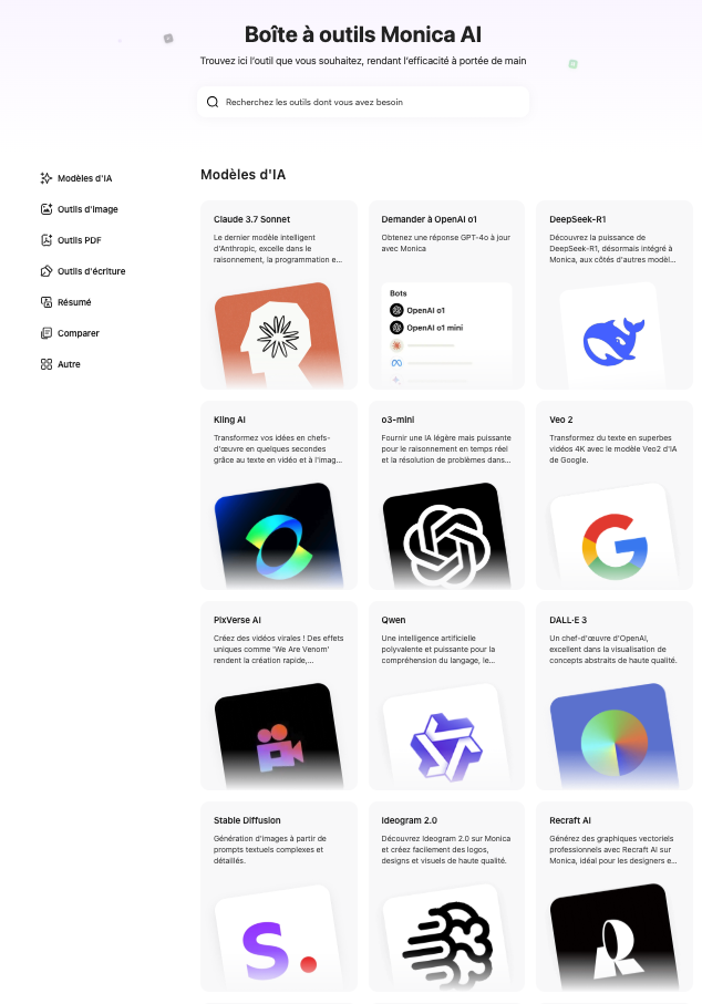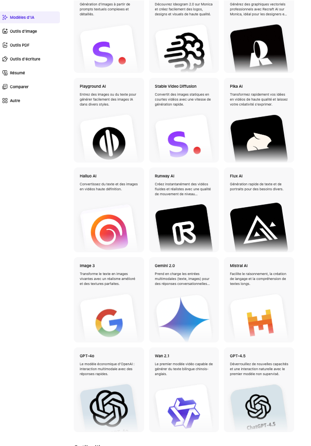 Les modèles textes et images les plus utilisés sont présents et sont accessibles dans des interfaces dédiés ou regroupés dans des outils spécifiques.