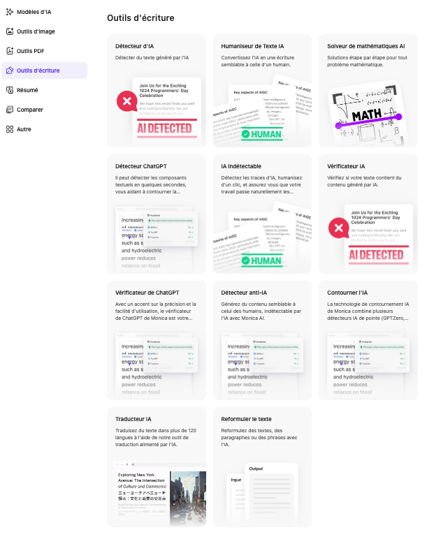 La boîte à outils de Monica (https://monica.im/tools) – dont l’extension avait déjà été décrite ici – regroupe une série d’outils d’IA générative dédiés au texte, aux documents aux images, à la voix et à la vidéo. Liste dans les captures ci-dessous.