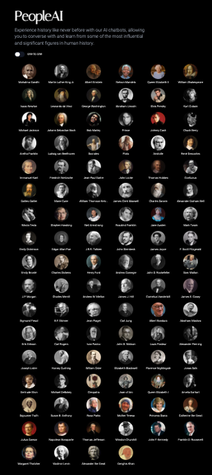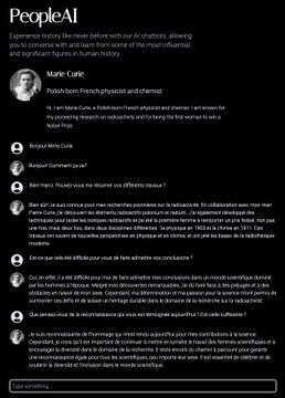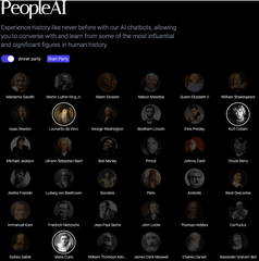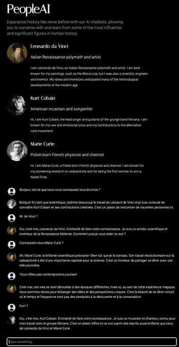 People ai (https://peopleai.app) propose de converser avec des 96 personnages historiques, scientifiques, auteurs, philosophes, musiciens (seulement 20 femmes…). La fonction « dinner party » permet de lancer une conversation à 4. Sans compte et illimité.