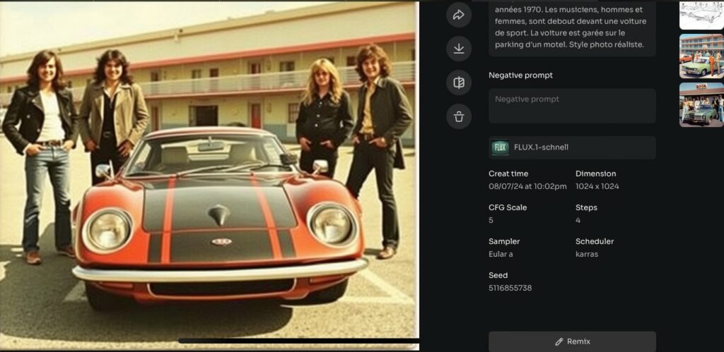 Pic Lumen (https://piclumen.com) génère des images à partir de trois modèles « maison » et Flux (cf #uneIAparjour du 02/08). Galerie, réglages avancés dont prompt négatif et seed, image to image, remix et effacement d’arrière-plan. Export et partage url. Illimité avec compte.