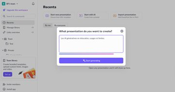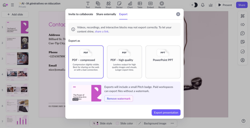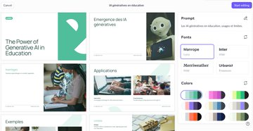 Pitch (http://pitch.com) génére des présentations éditables à partir d’un prompt. Dans la version gratuite illimitée : thèmes, édition complète, présentation en direct et exports avec filigrane. Partage par lien et collaboratif version payante.