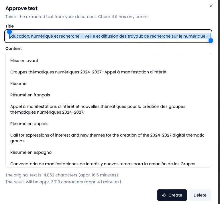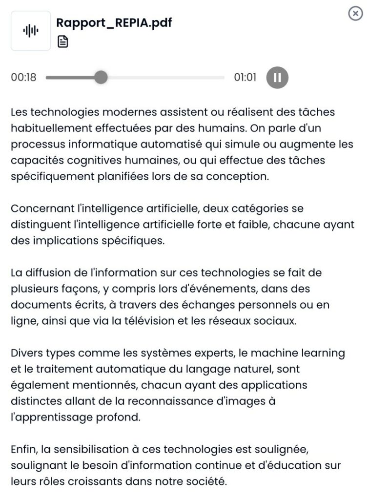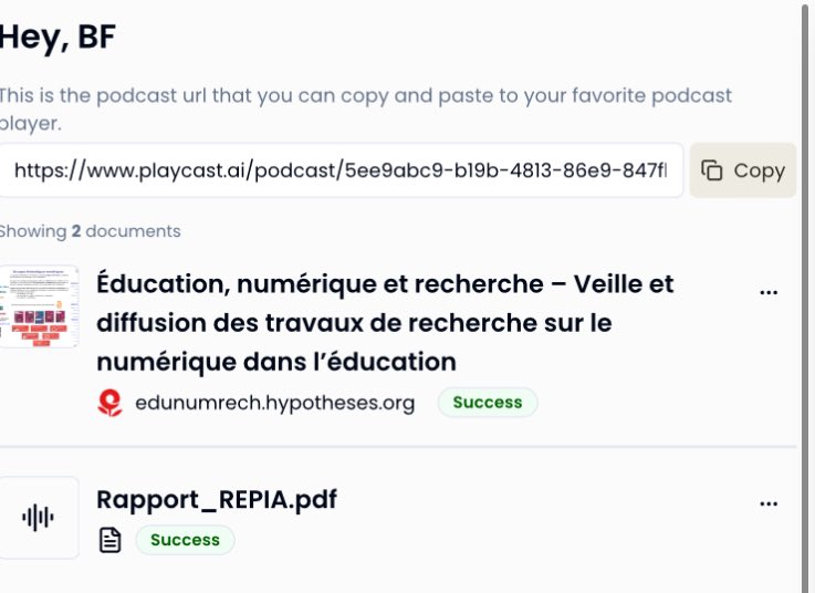 Playcast (https://playcast.ai) génère des résumés de textes, de documents, d’URL ou de vidéo YouTube sous forme d’épisodes de podcast disponibles dans les applis dédiées. Exemple dans Apple podcast. Galerie, FR ok. 5 documents / épisodes gratuits.