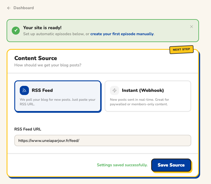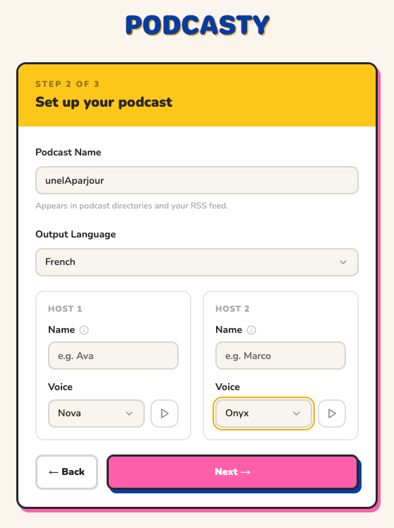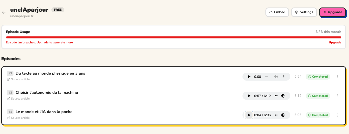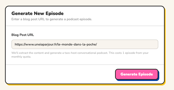 Podcasty (https://podcasty.fm/) génère des épisodes de podcast à partir d’articles en lignes.