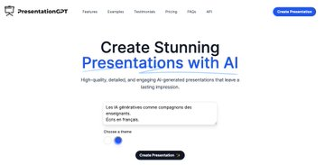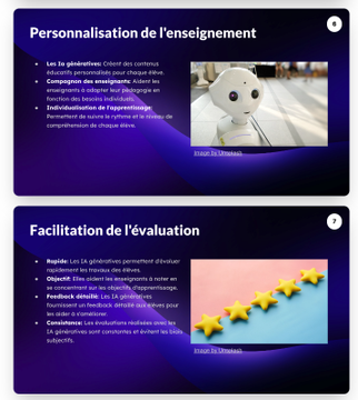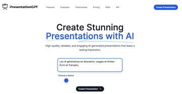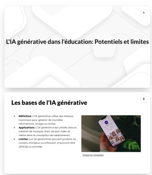 PresentationGPT (https://presentationgpt.com) génére une présentation à partir d’un prompt. En FR si spécifié. 15 diapos maxi et partage en ligne seul en version gratuite. Sans compte et illimité. Tests : https://presentationgpt.com/?presentationId=RASY_Ev et https://presentationgpt.com/?presentationId=eSiEhTI