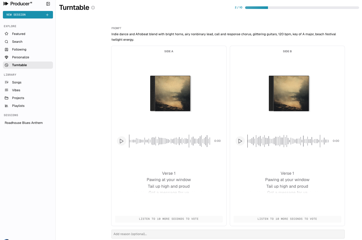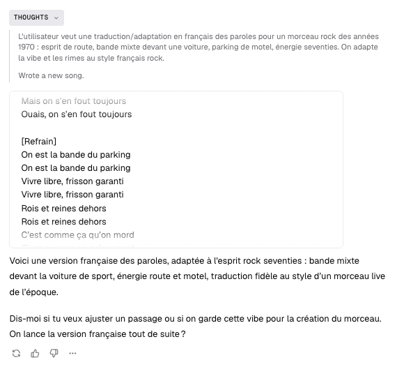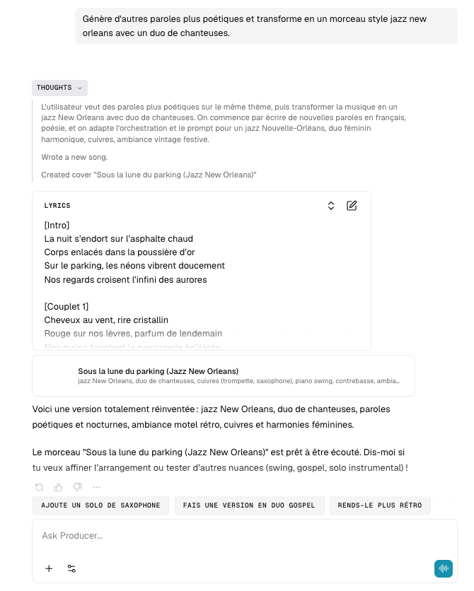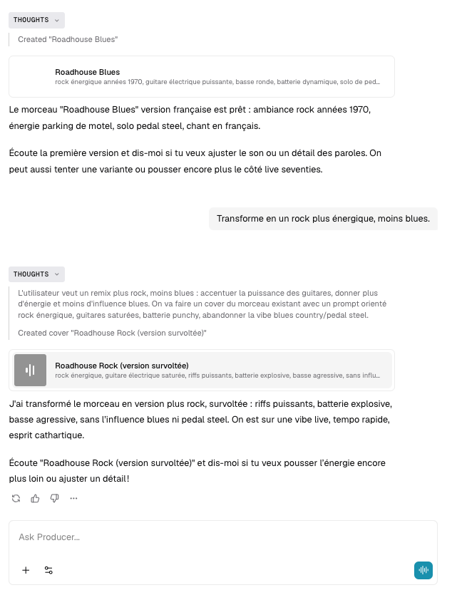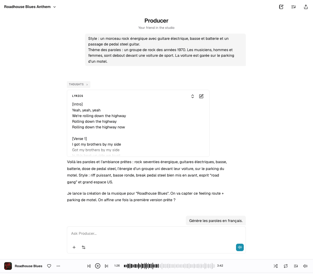 Producer (https://www.producer.ai/) génère des morceaux de musique paroles et musique à partir d’instructions via un chatbot.