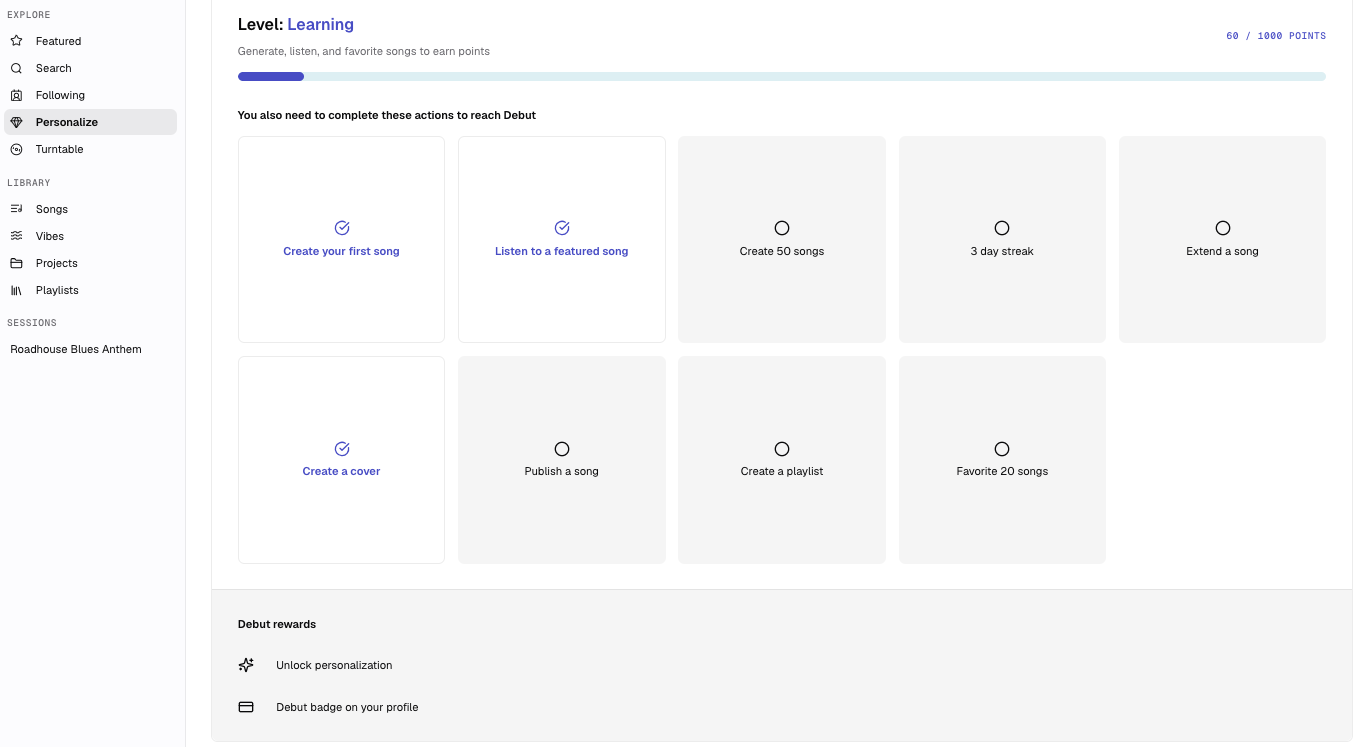 60 crédits gratuits par jour (6 morceaux environ), 500 crédits supplémentaires à l’ouverture et des crédits peuvent être obtenus en réalisant des tâches.