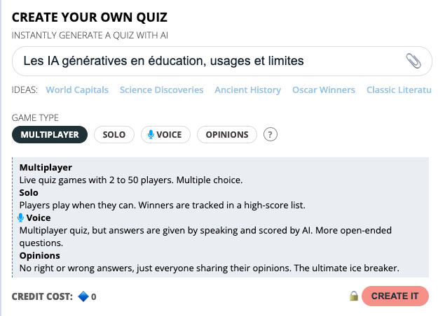 En version gratuite, choix multiples et opinions avec 10 questions par quiz. 5 crédits à l’inscription pour le mode solo (1 crédit par quiz) ou le mode voix avec d’autres types de questions proposées (5 crédits), édition en mode payant.