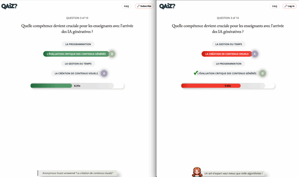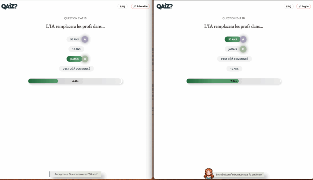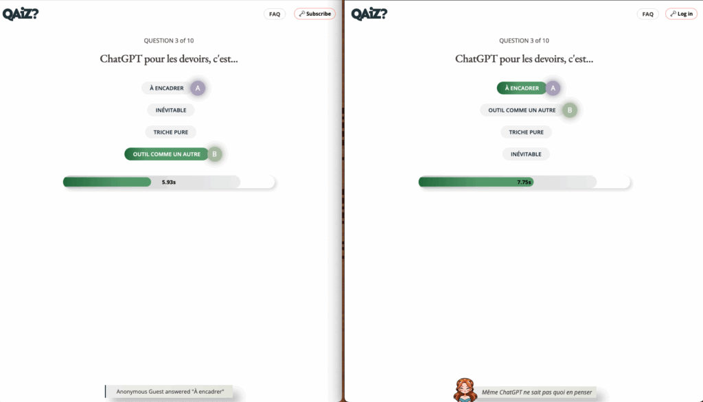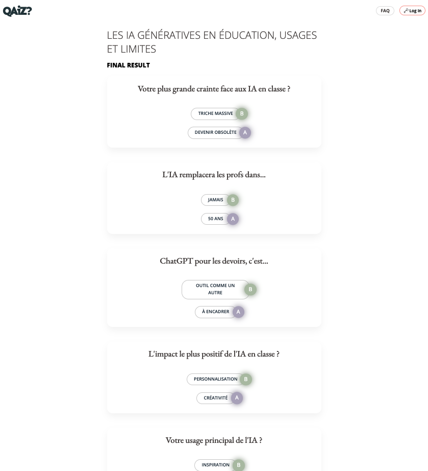 Qaiz (https://qaiz.app/) génère des quiz en ligne à partir d’une instruction, à choix multiples ou « d’opinion ».