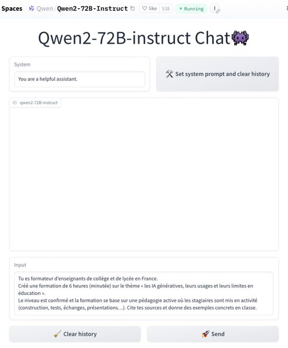 Qwen 2 (projet : https://huggingface.co/Qwen et demo sur Hugging Face : https://huggingface.co/spaces/Qwen/Qwen2-57b-a14b-instruct-demo…) est un modèle de langage open source développé par @AlibabaGroup.