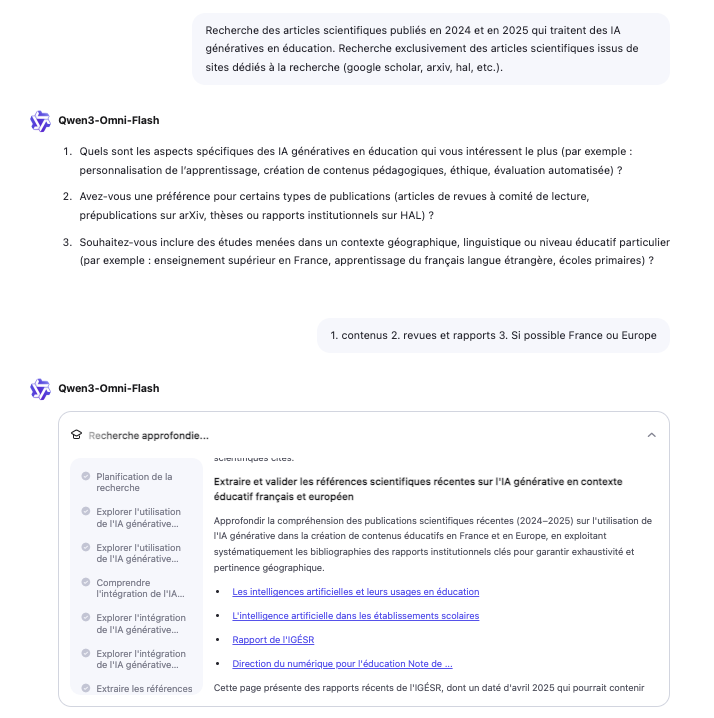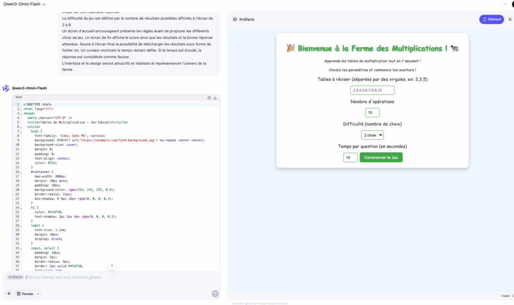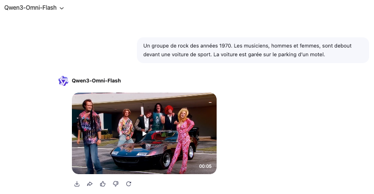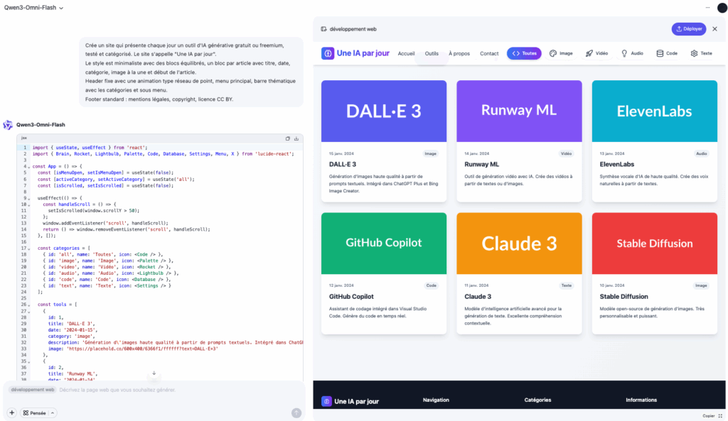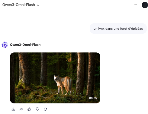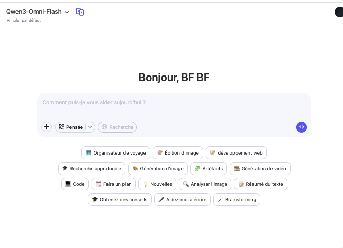 Qwen 3 Omni (documentation : https://github.com/QwenLM/Qwen3-Omni et utilisation sur hugging Face https://huggingface.co/collections/Qwen/qwen3-omni-68d100a86cd0906843ceccbe ou Qwen Chat) est un modèle de langage « omnimodal » avec la capacité de générer des contenus aux formes multiples : texte, recherche approfondie avec rapport, image, vidéo, analyse de documents, analyse d’image, voix, site web, applications avec hébergement possible, etc.