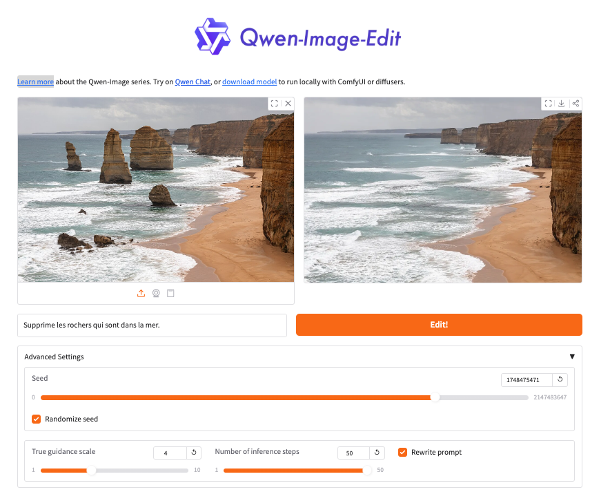 Qwen Image Edit (démonstration : https://huggingface.co/spaces/Qwen/Qwen-Image-Edit et documentation : https://huggingface.co/Qwen/Qwen-Image-Edit, également disponible sur Qwen Chat) modifie une image source à partir d’une instruction.