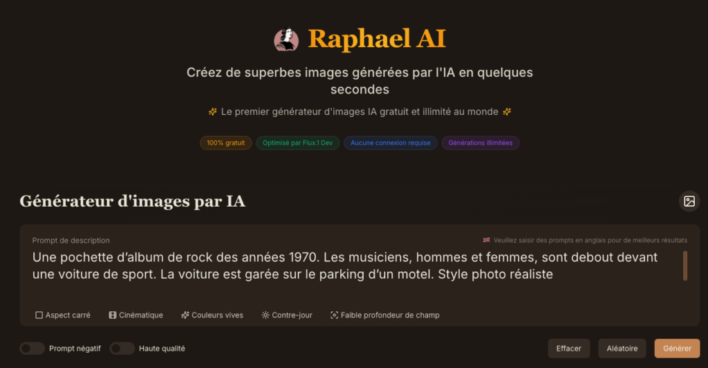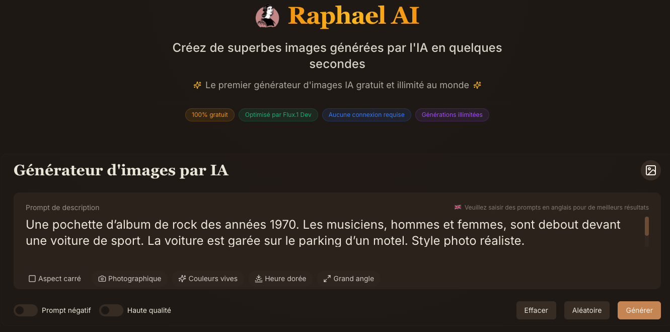 Raphael (https://raphael.app/fr) génère des images en se basant sur le modèle Flux-1 Dev.