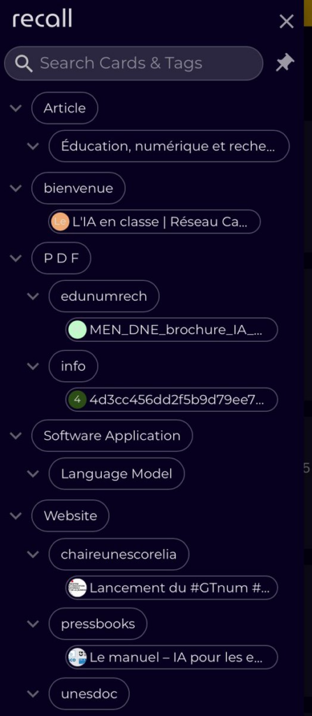 Recall (https://getrecall.ai) résume des pages web (+ pdf en ligne) et établit des liens via des mots clés. Propose également des quiz pour chacune. FR ok si spécifié dans les paramètres. Web, app et extension. 10 résumés éditables gratuits.