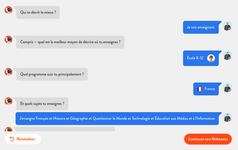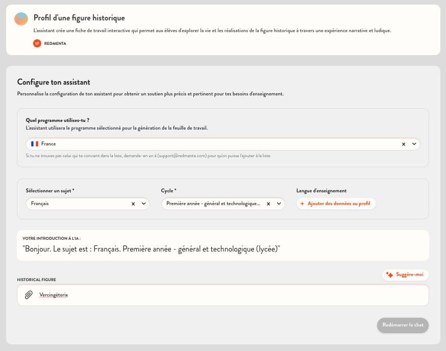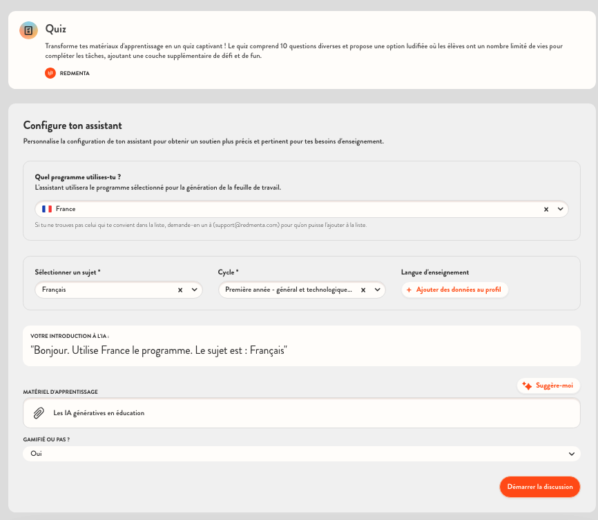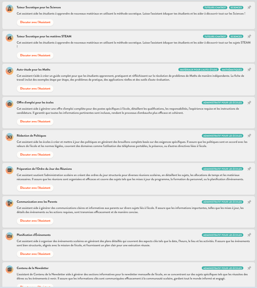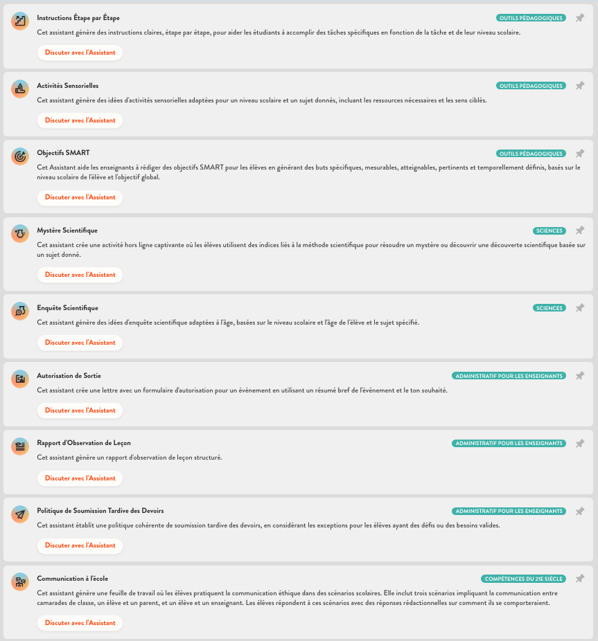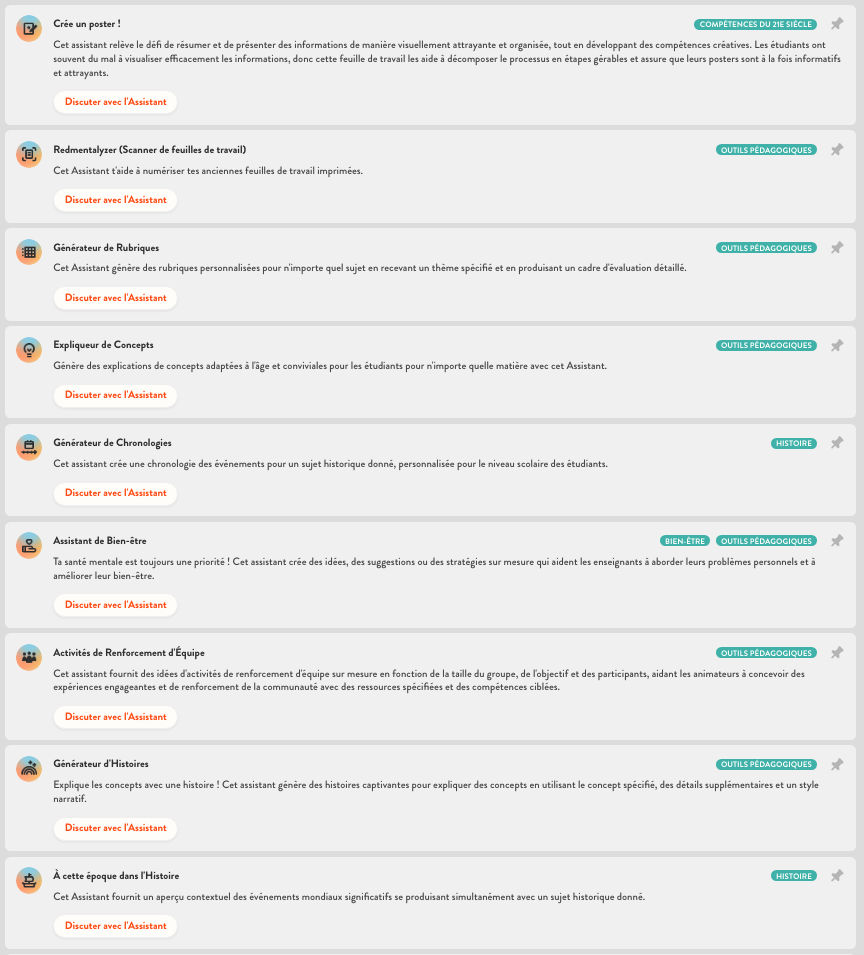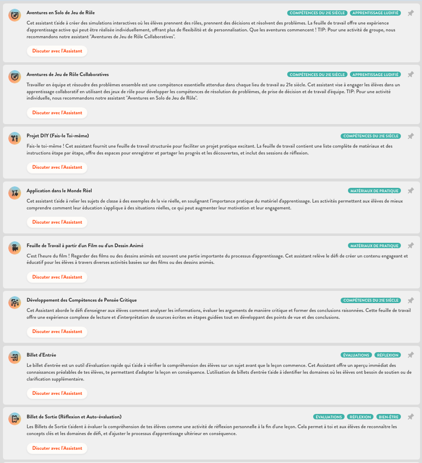 Redmenta (https://redmenta.com/fr) crée des fiches d’activités à partir de chatbots spécialisés (plus de 150 disponibles) par discipline, évaluation, méthodes, aide administrative… Français pris en charge (quelques erreurs de traduction dans l’interface).